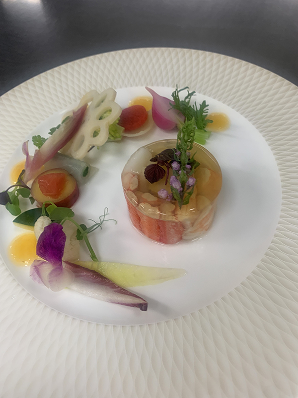 - 前菜:プルミエ「海の幸のガトー 彩り豊かな野菜のマリネと共に」