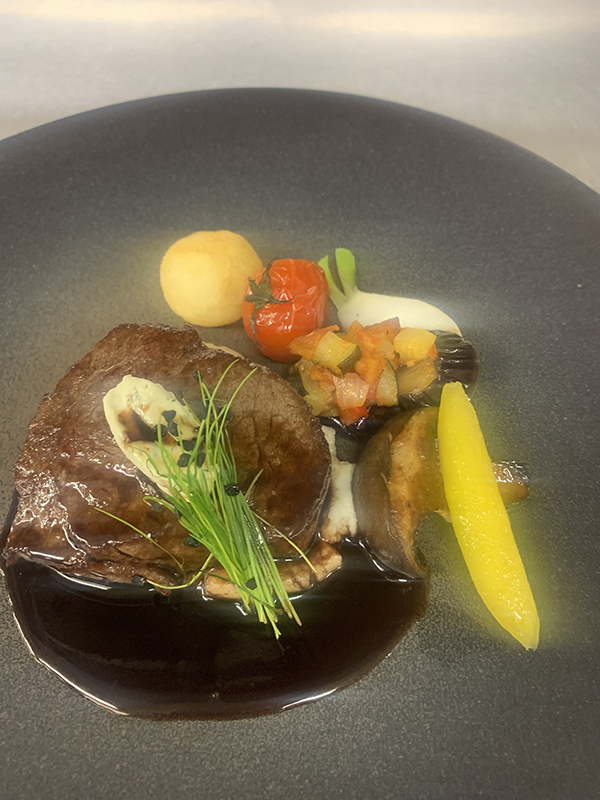 メインの魚料理は、新鮮なスズキを主役に。ふっくらと焼き上げたスズキに、ハーブの香りが食欲をそそる特製のカフェ・ド・パリ風ソースを添えました。さらに、華やかな香りのシャンパンを贅沢に使ったソースが、淡白でありながらも深みのあるスズキの旨味を一層引き立て、高貴な味わいを生み出します。見た目も美しく、食卓を華やかに彩る、特別な一皿として、自信を持ってお届けします。