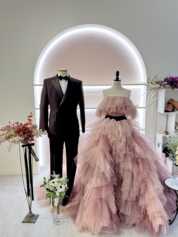 一見異なる色のドレスとタキシードでも、共通のカラー(ブラウン)が橋渡し役となることで、おふたりが並んだ時に驚くほど統一感のある、ハイセンスなカップルコーデが完成します。こうした細かな色使いの計算こそ、コーディネーターの腕の見せ所です。
