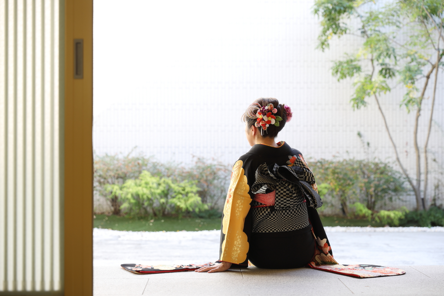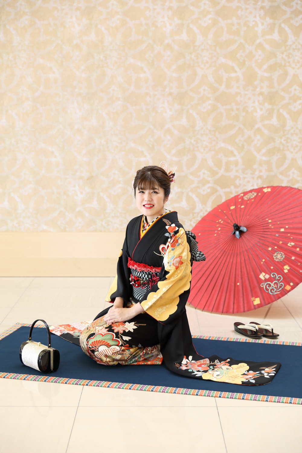 黒の着物と真っ赤な紅葉の映える組み合わせの中、
