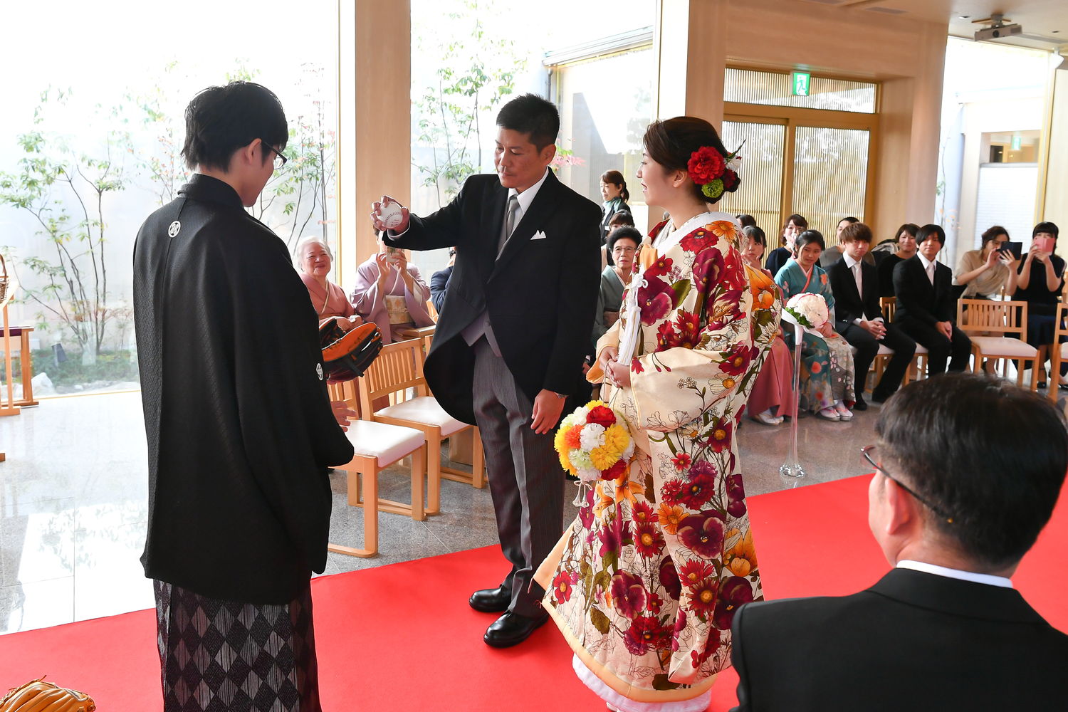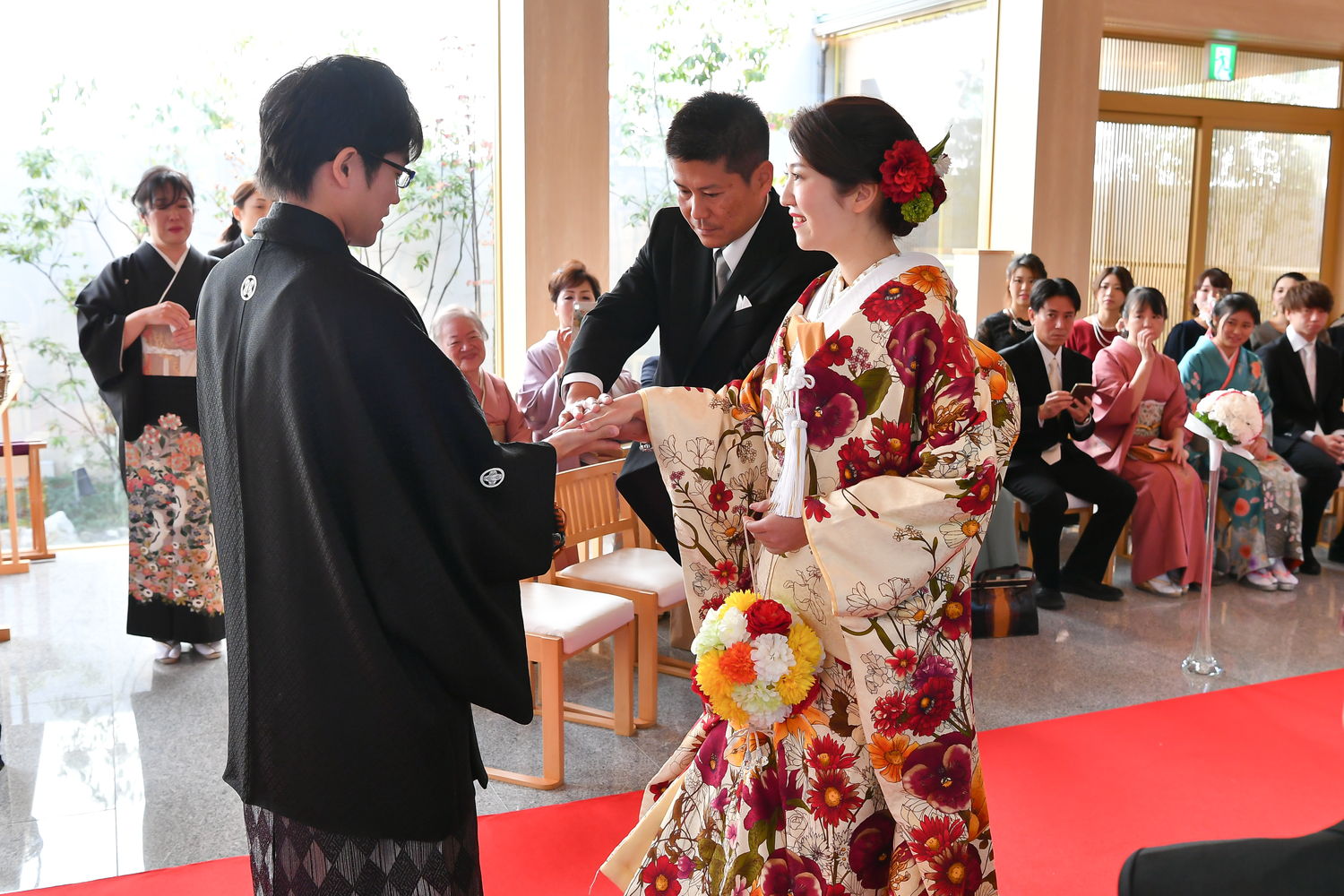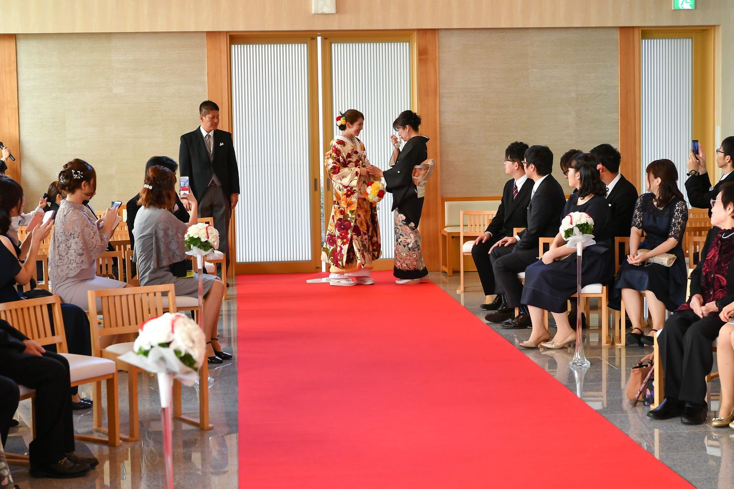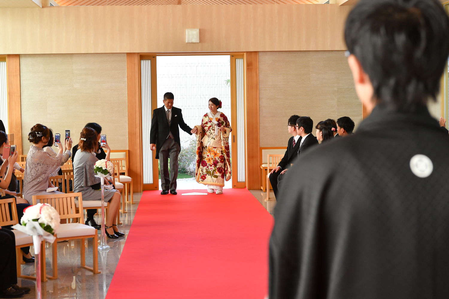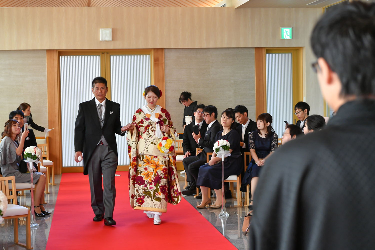 新婦様の入場では、お母様からブーケを受け取り、お父様とともに新郎様のもとへ…。