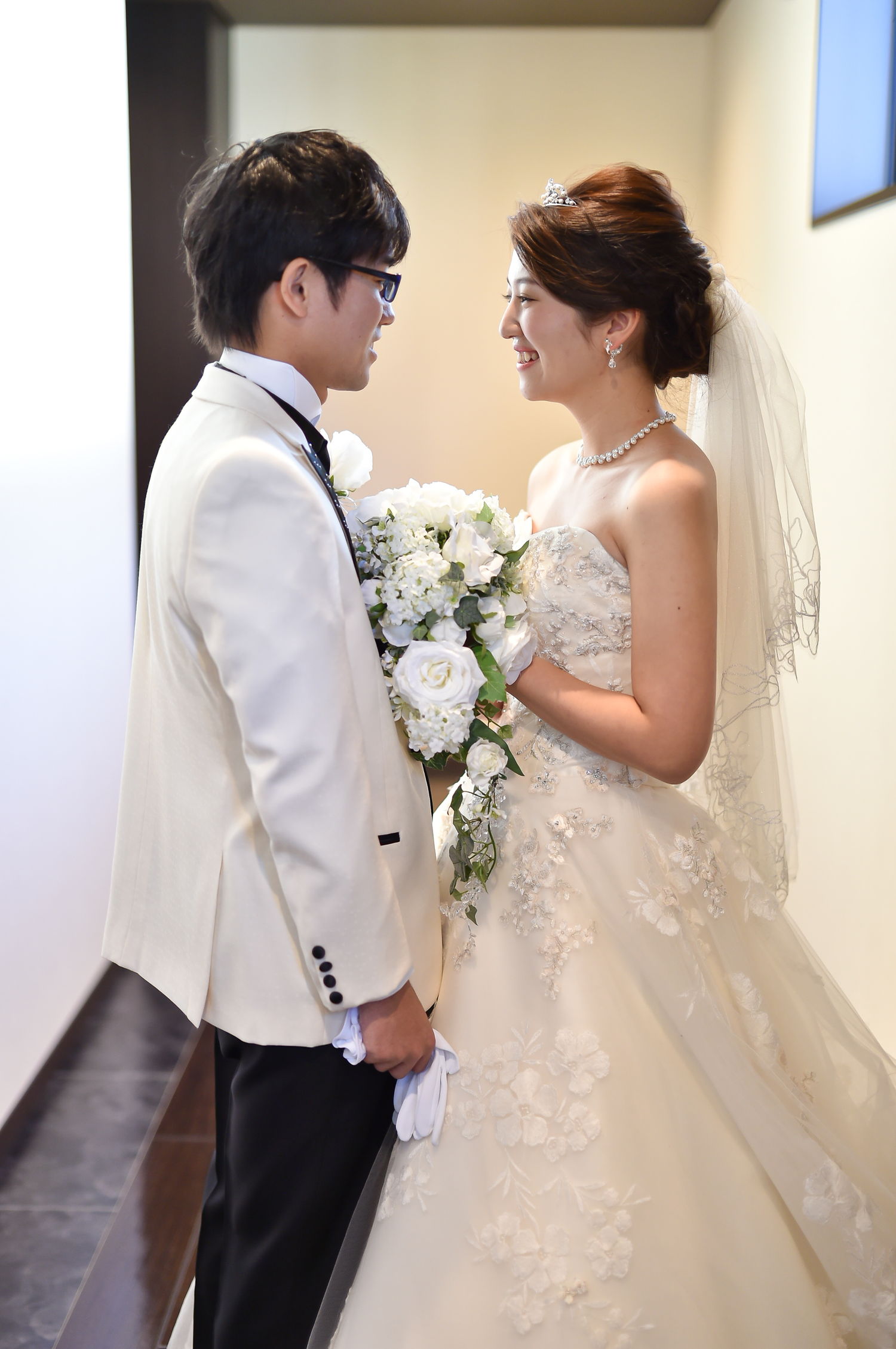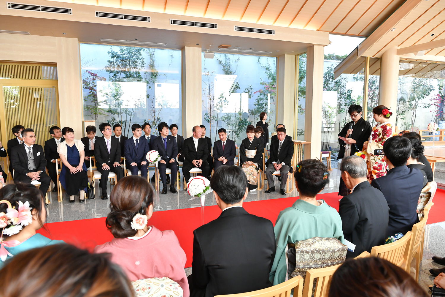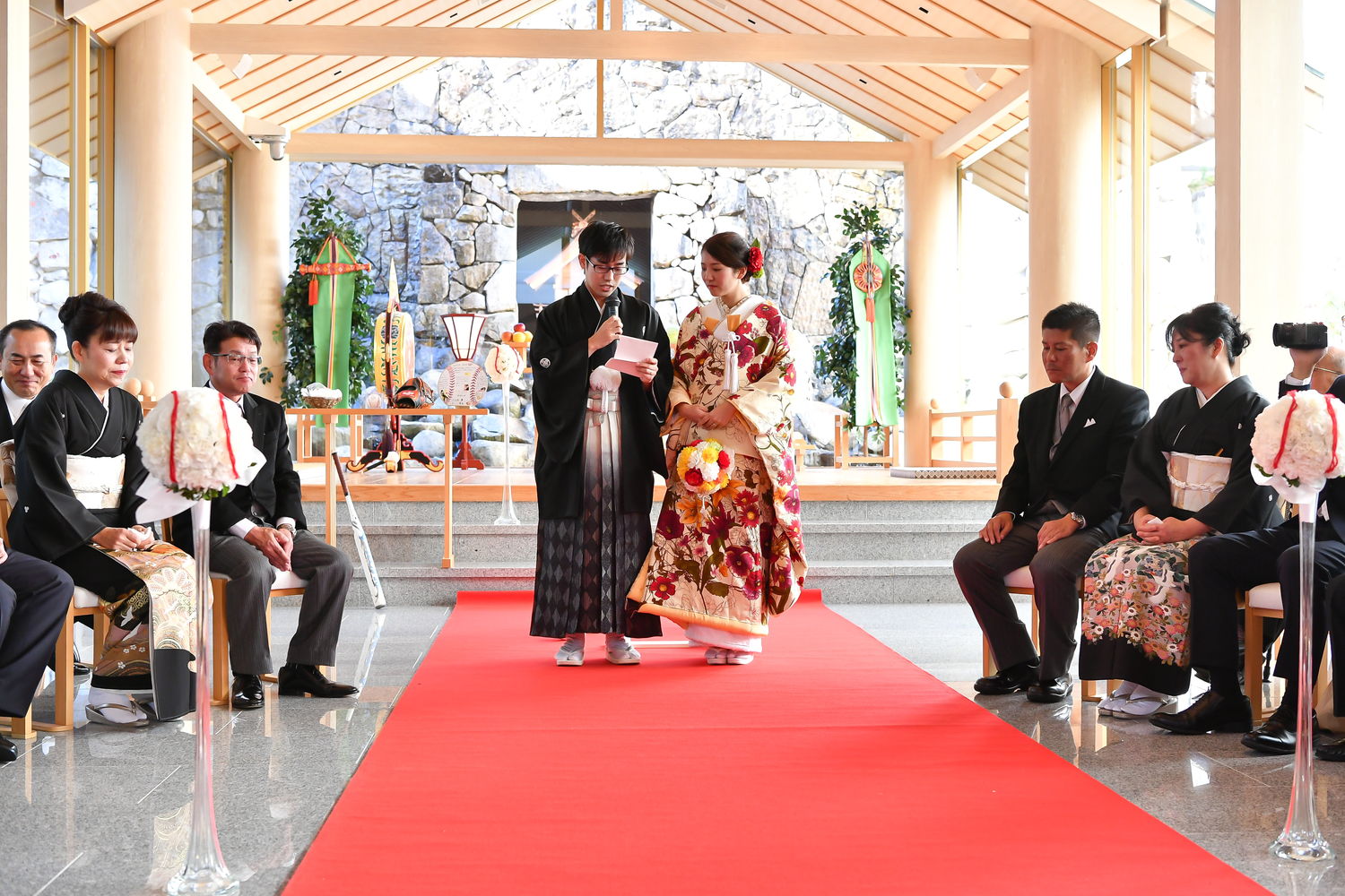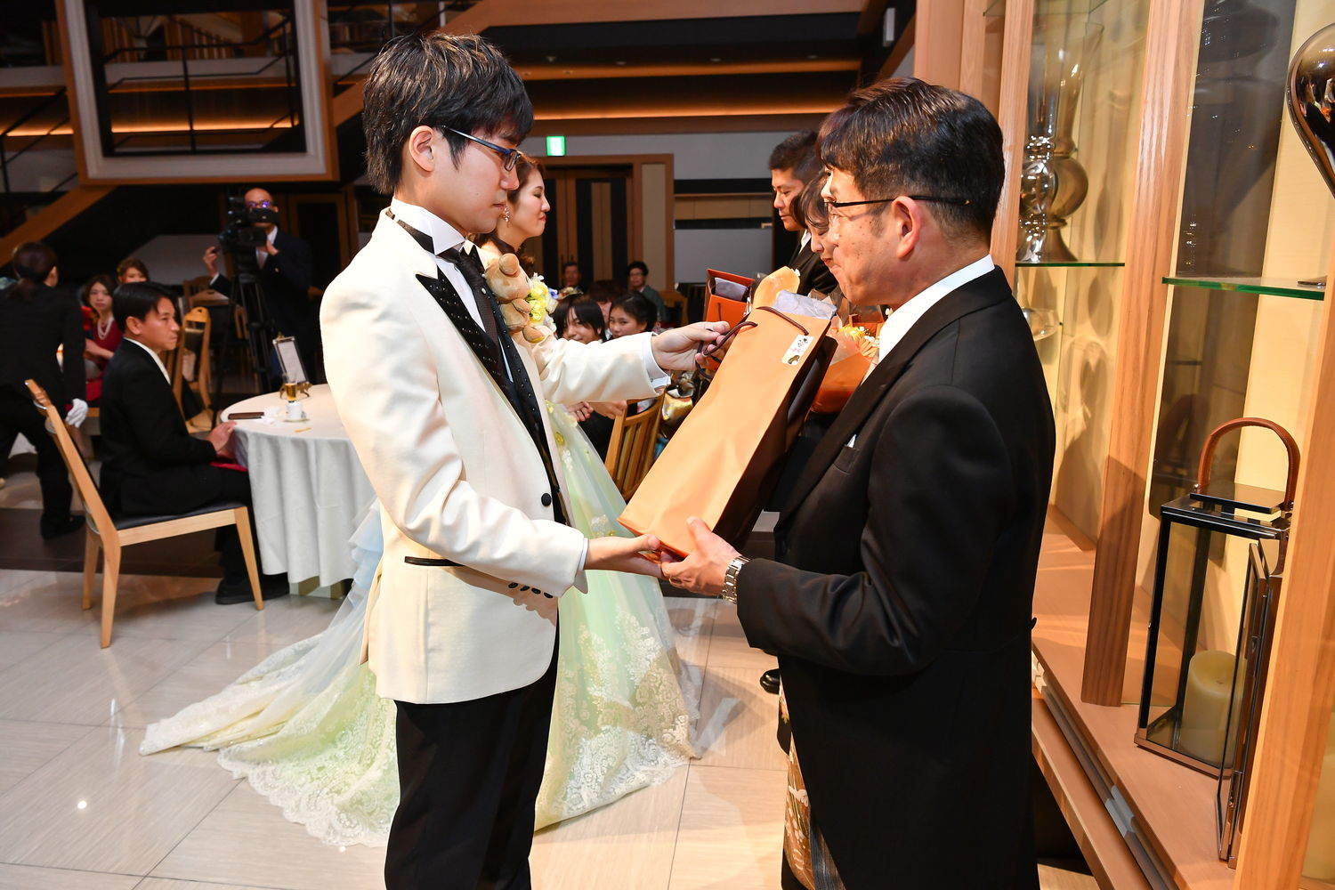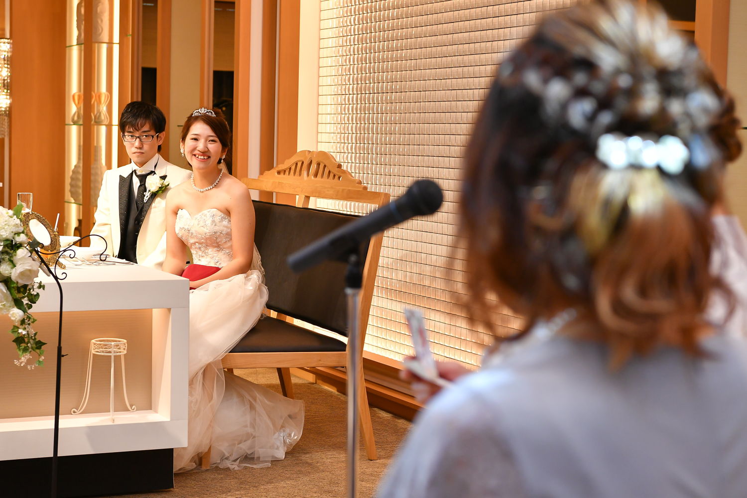 新婦様の入場では、お母様からブーケを受け取り、お父様とともに新郎様のもとへ…。
