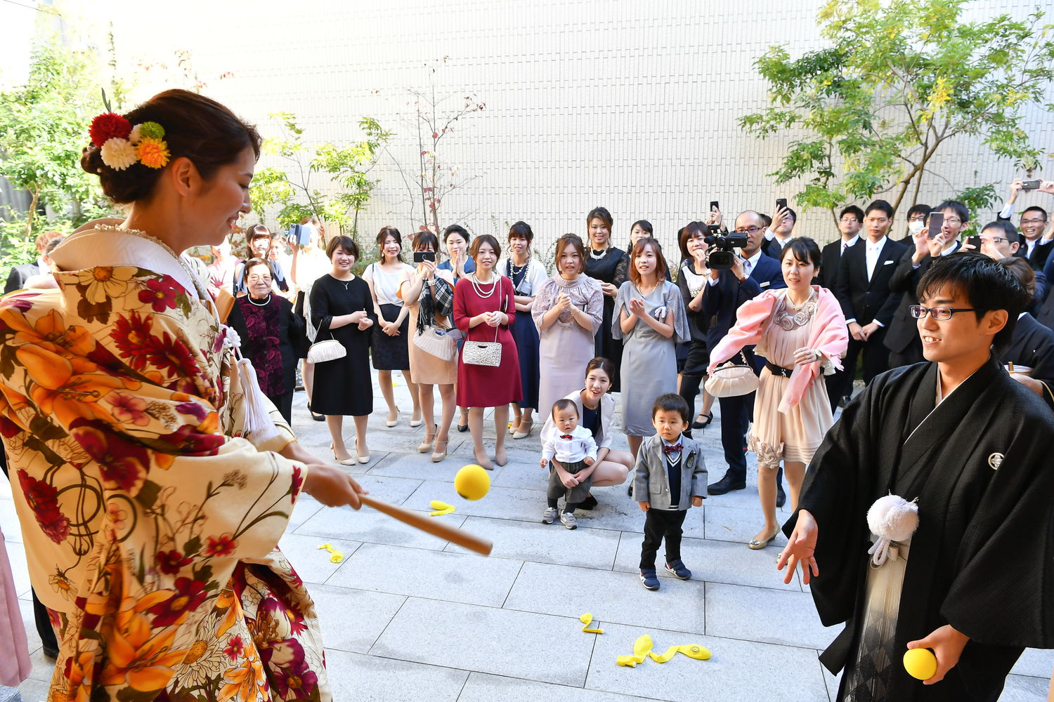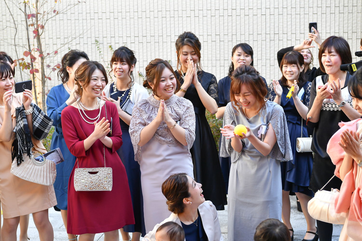 そしてブーケトスならぬ「バット・トス」では、ボールをキャッチしたゲストにミニブーケをプレゼント。