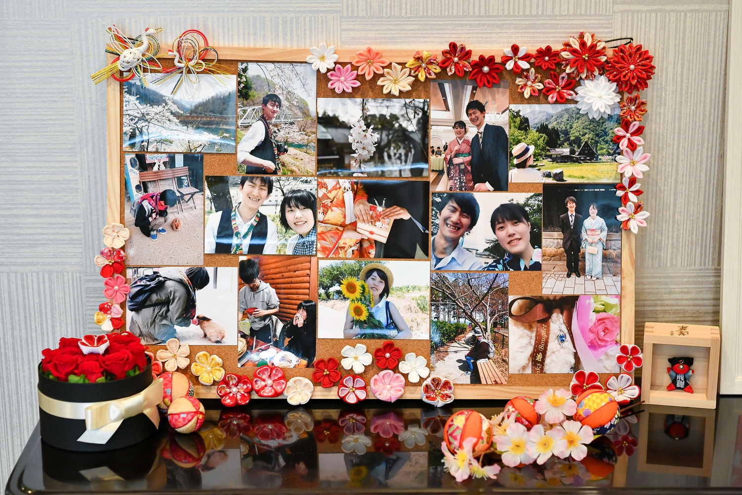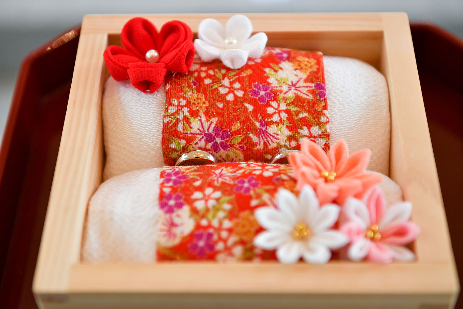 きれいなつまみ細工の花が飾られた「リングピロー」やウェルカムボード。