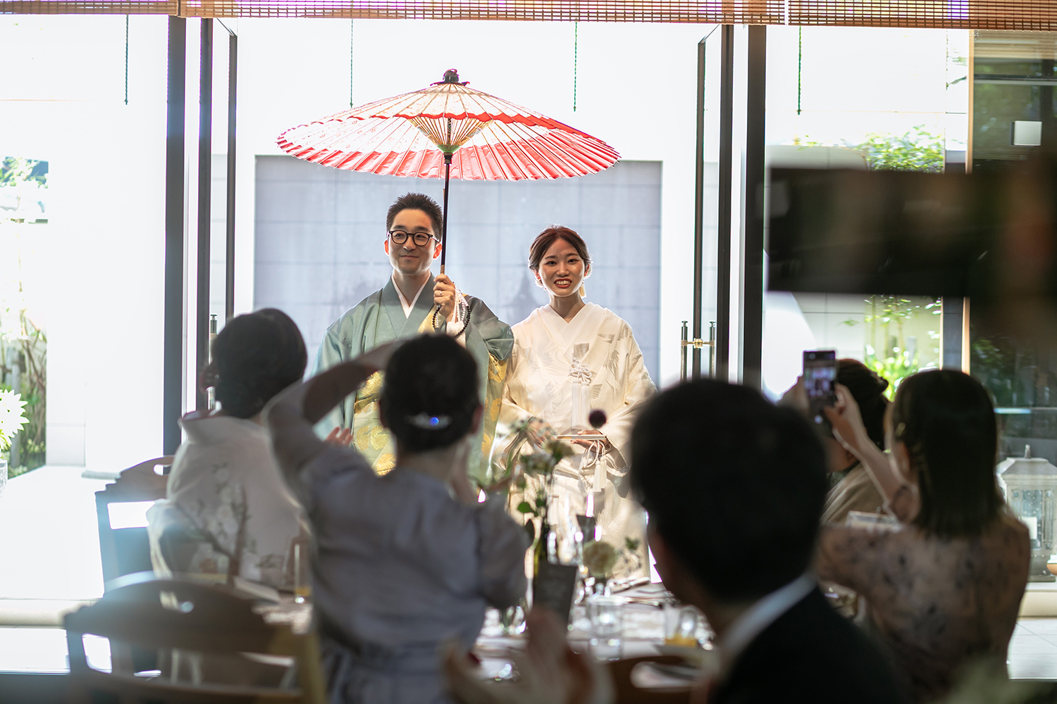 そして式の最中はゲストとなかなかお話しができないため新郎新婦が会場の入り口に立ち 迎賓を行いました
