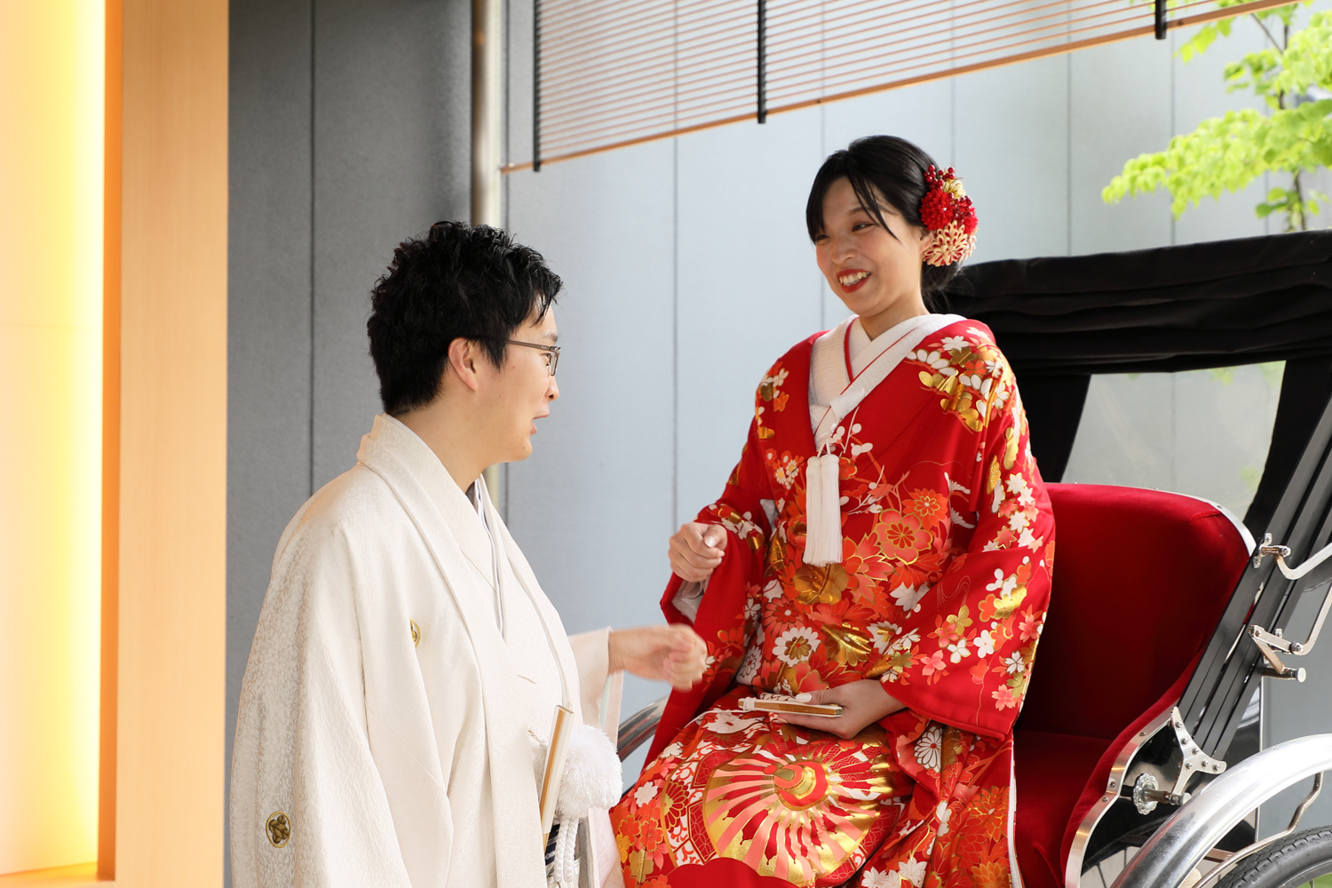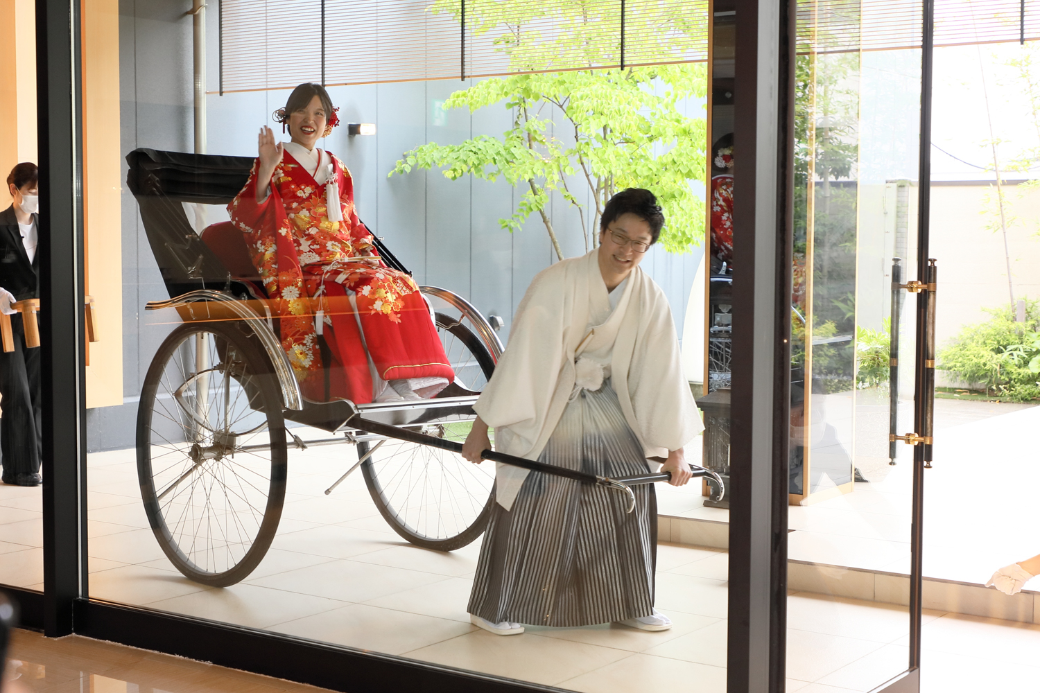 ゲストの方も一緒に楽しんでくれるようにお菓子まきや人力車での入場