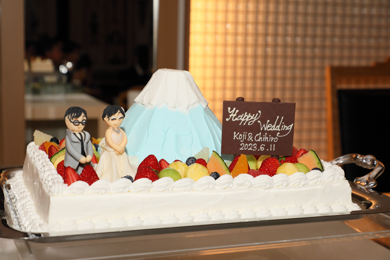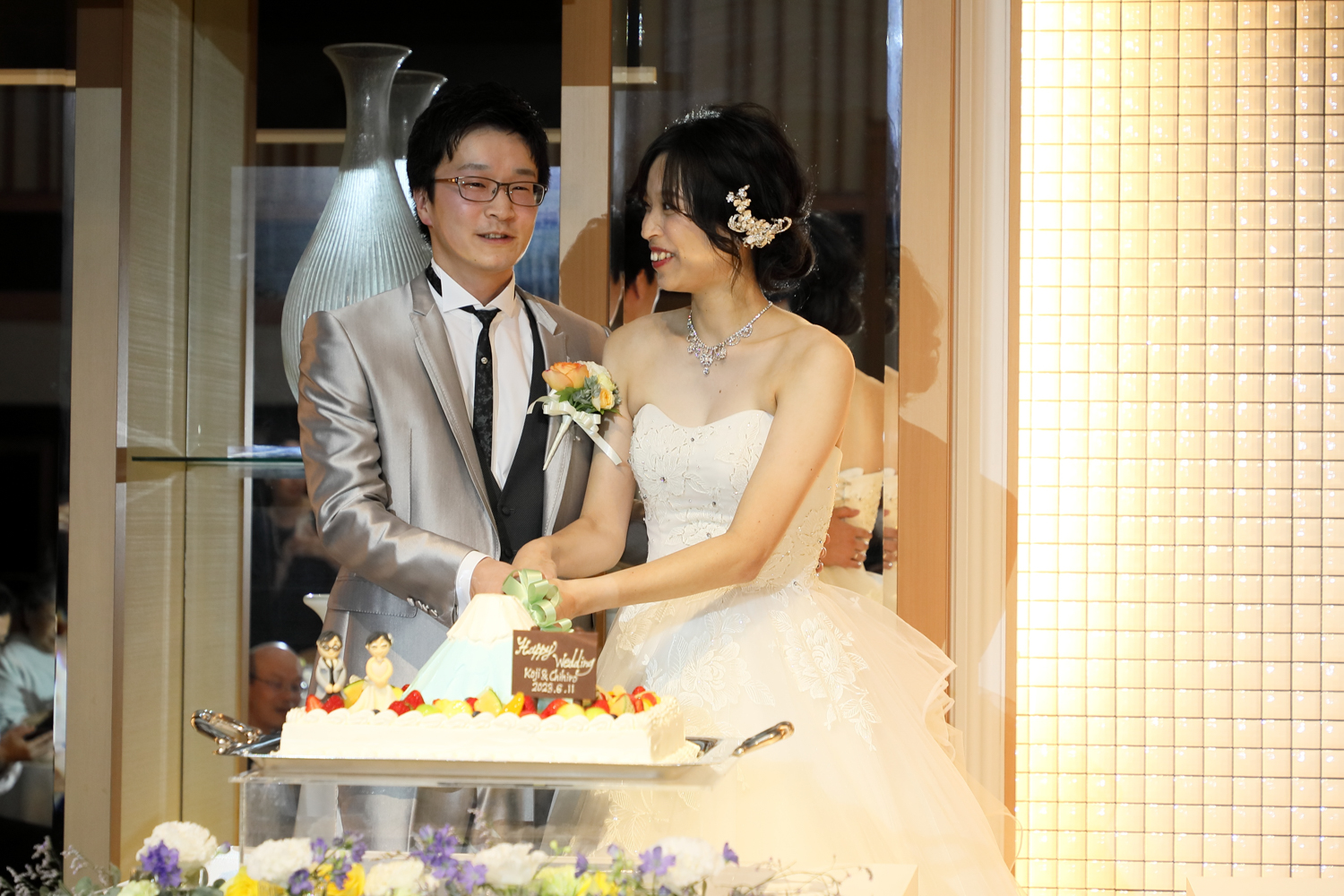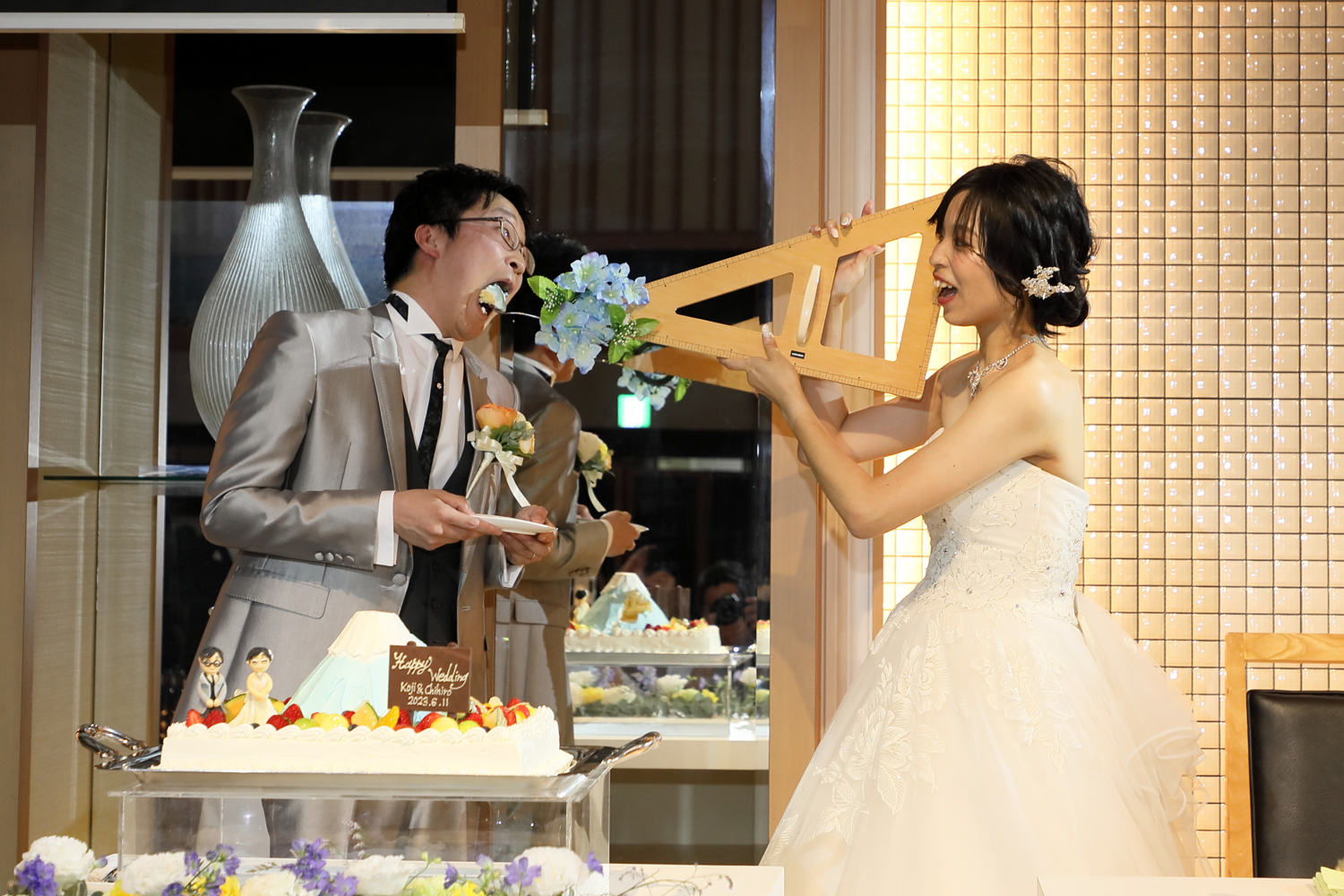 新郎の仕事道具である大きな三角定規でのファーストバイトなど工夫しました