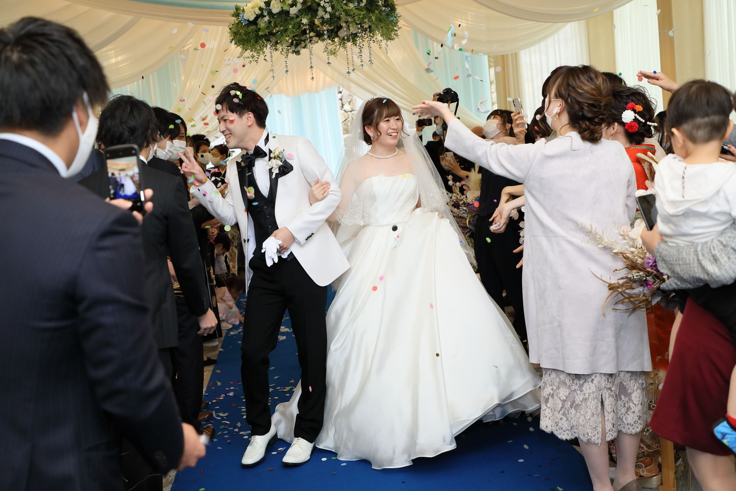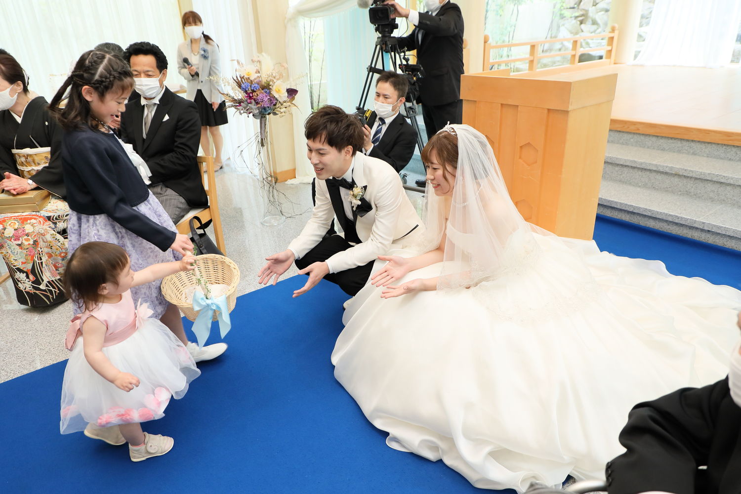 ゲストの皆様からの祝福のフラワーシャワーを受け