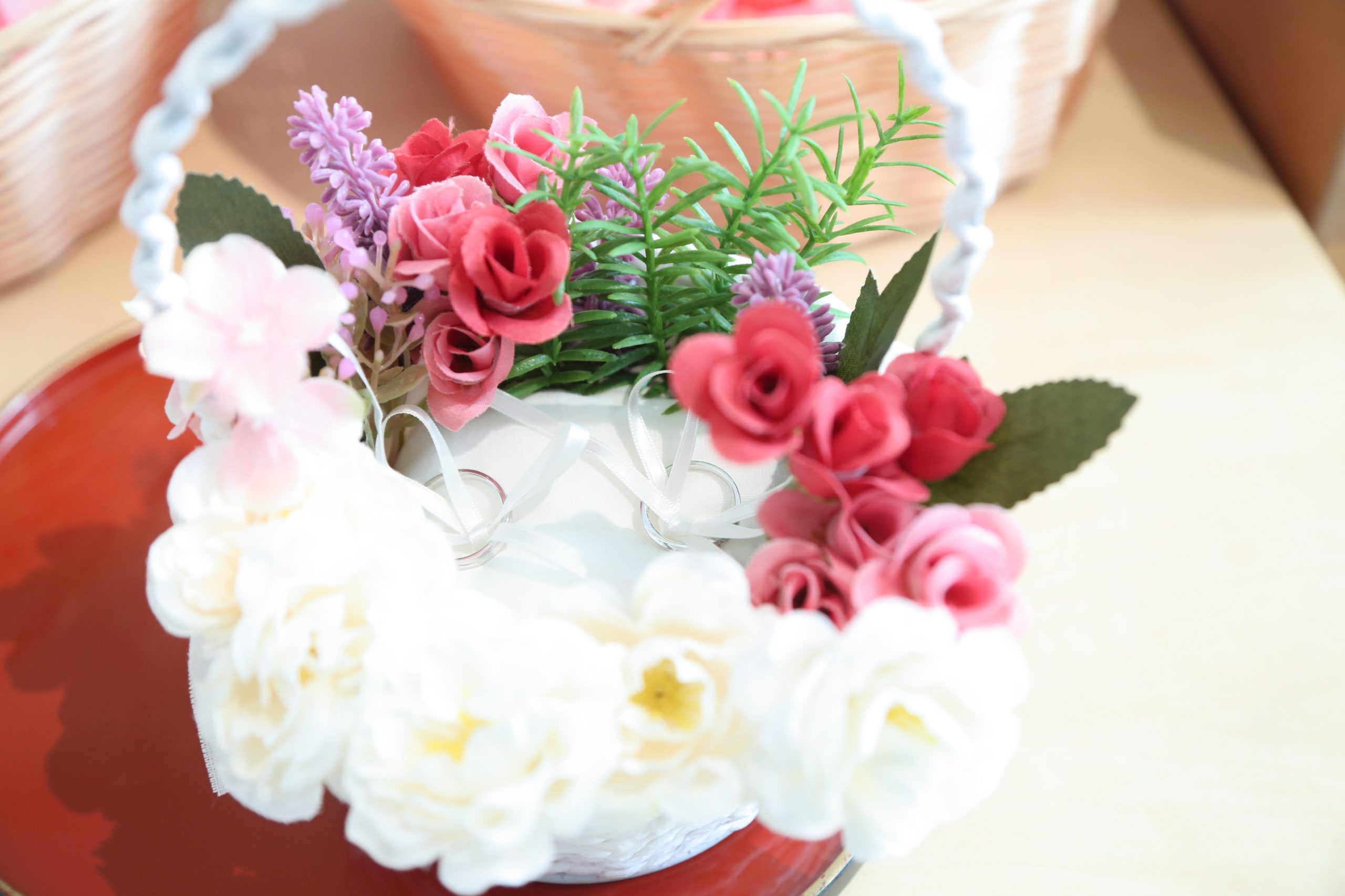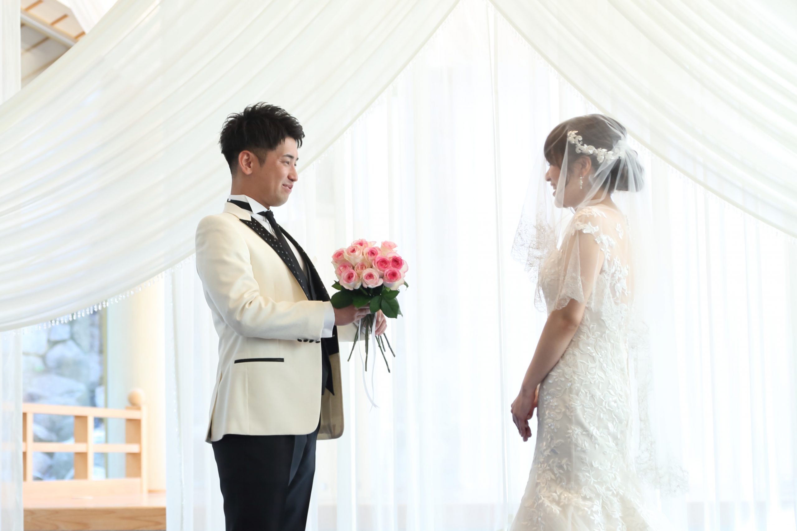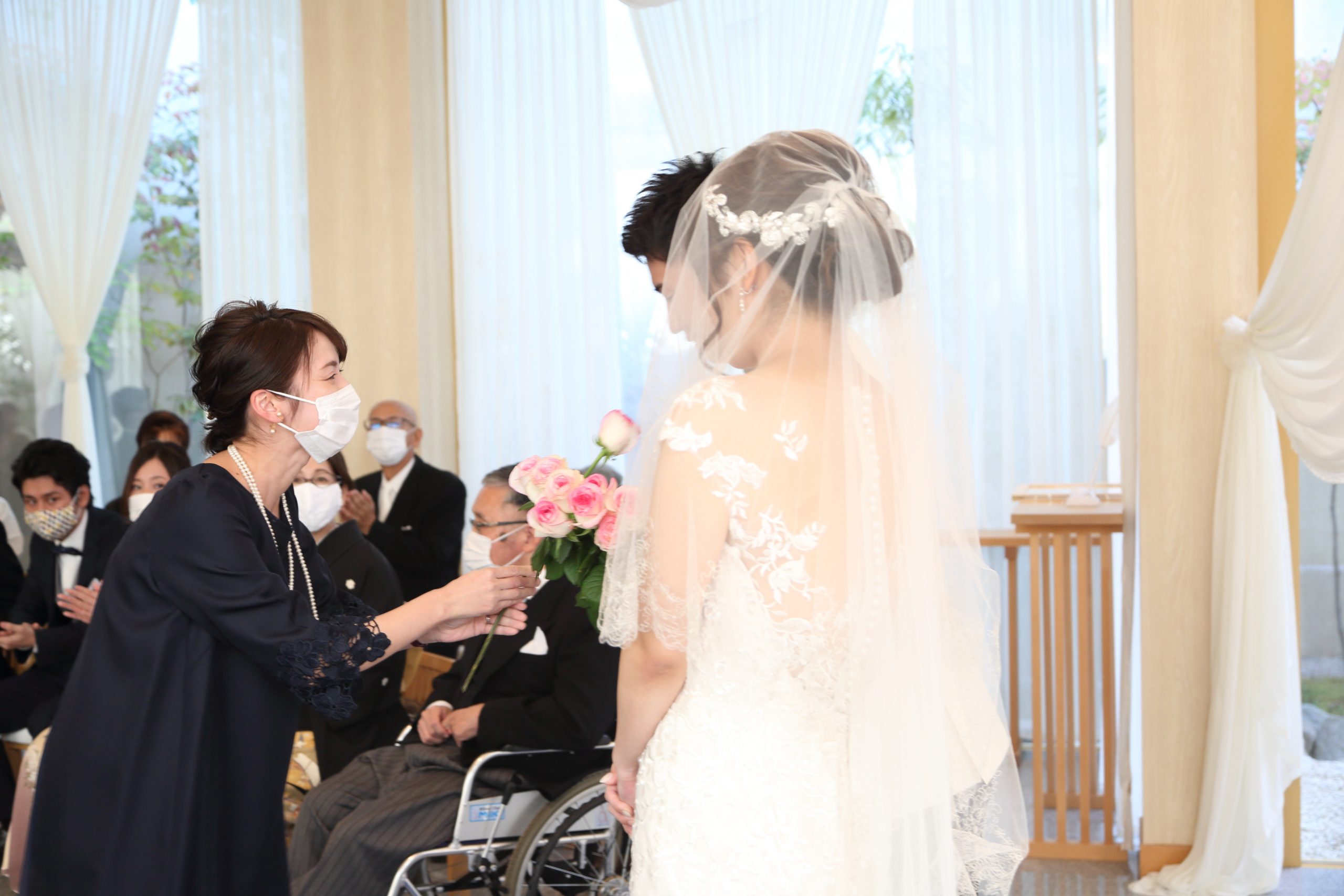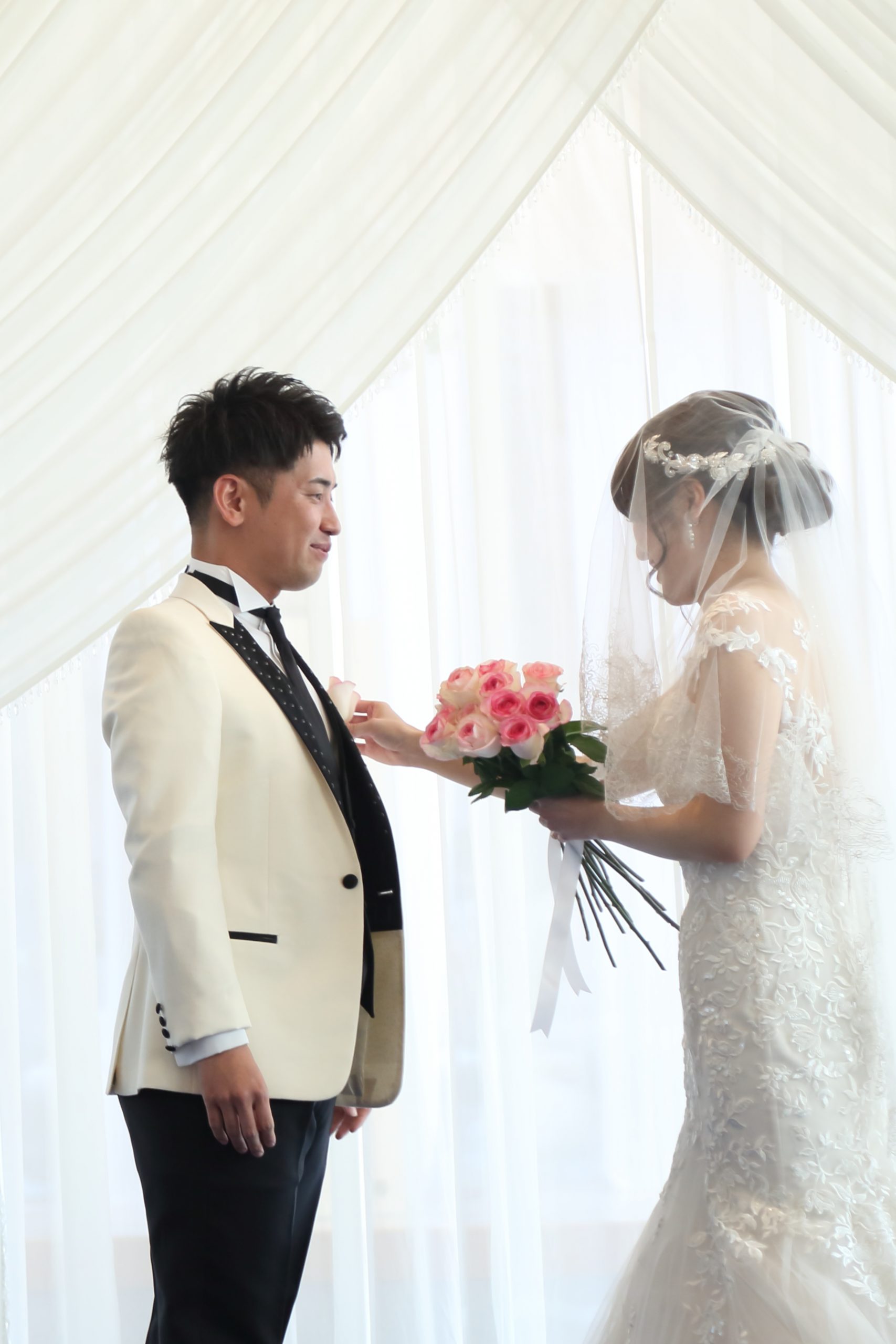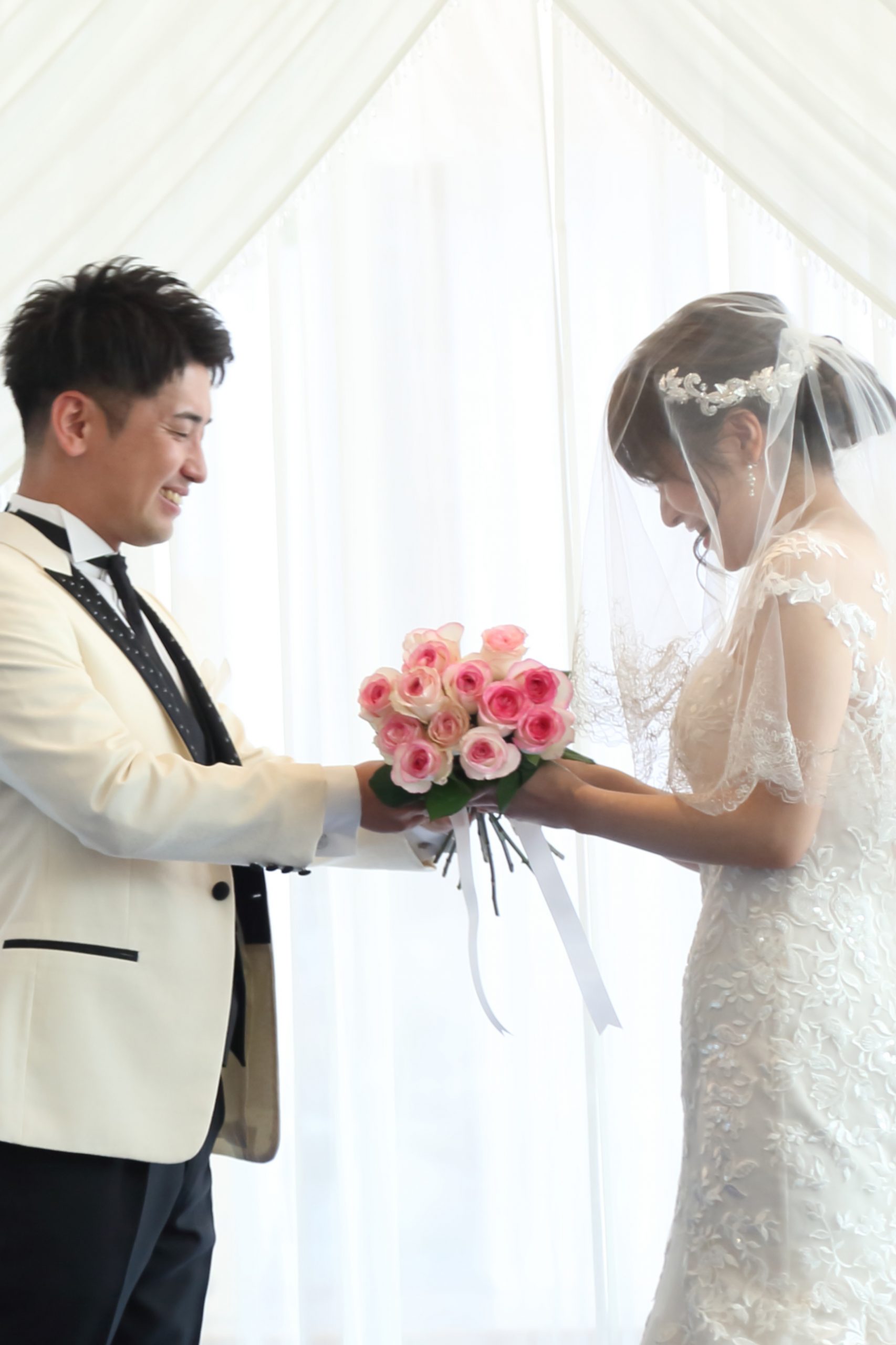 新郎様が皆様から頂いたバラの花を新婦様にお渡しする