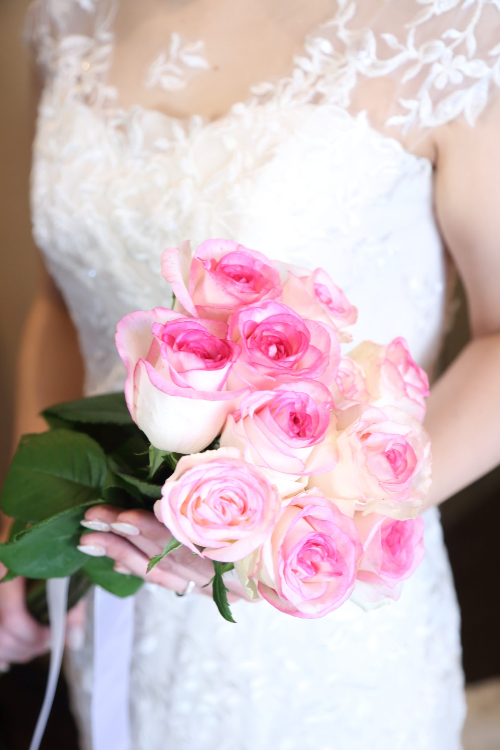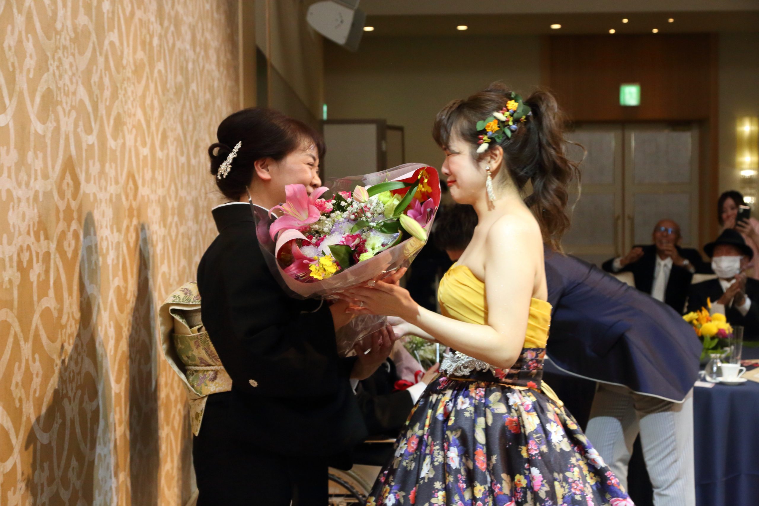 新郎様から頂いたバラの花束を手におふたりの披露宴のスタートです