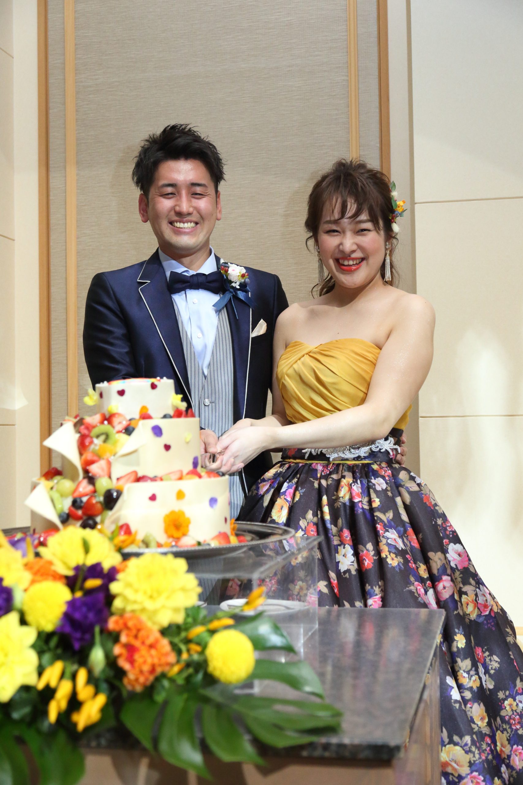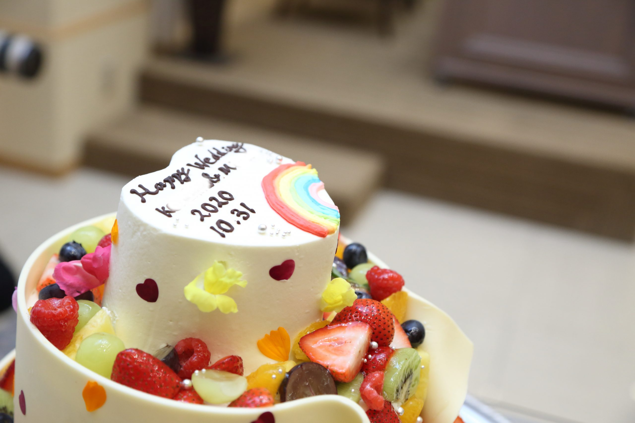 おふたりのウエディングケーキはフルーツたっぷりのフルーツシャワーケーキ!お花も入ってとても華やかなケーキでした!