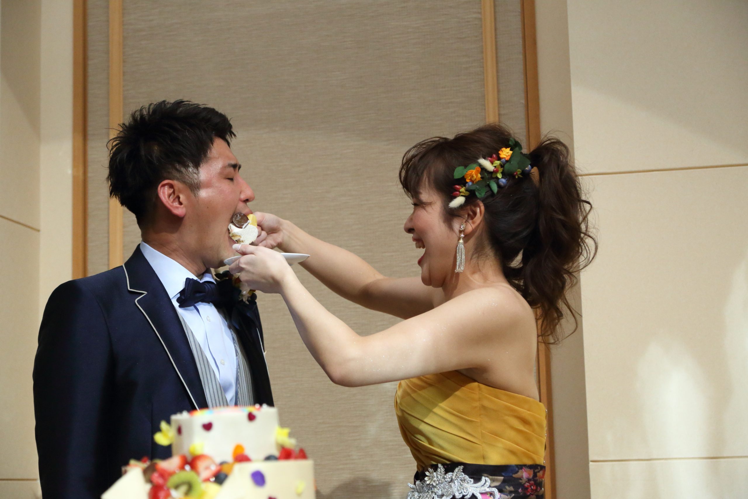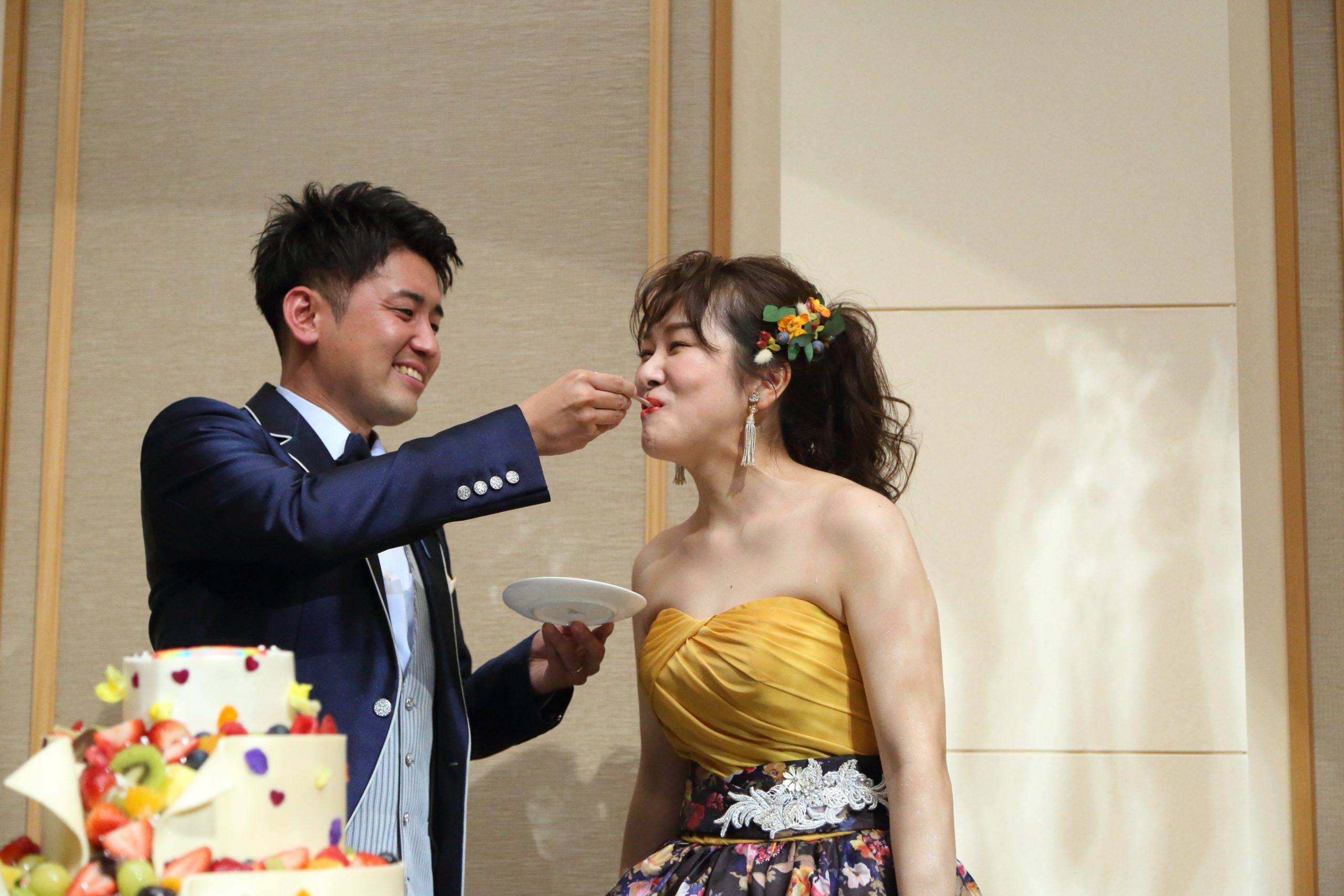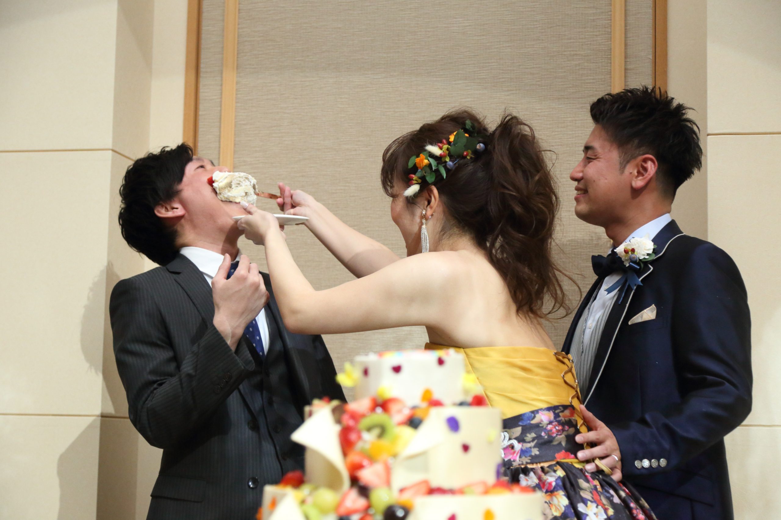 ケーキ入刀、ファーストバイトの後にはおふたりのキューピットの方へのサンクスバイト!