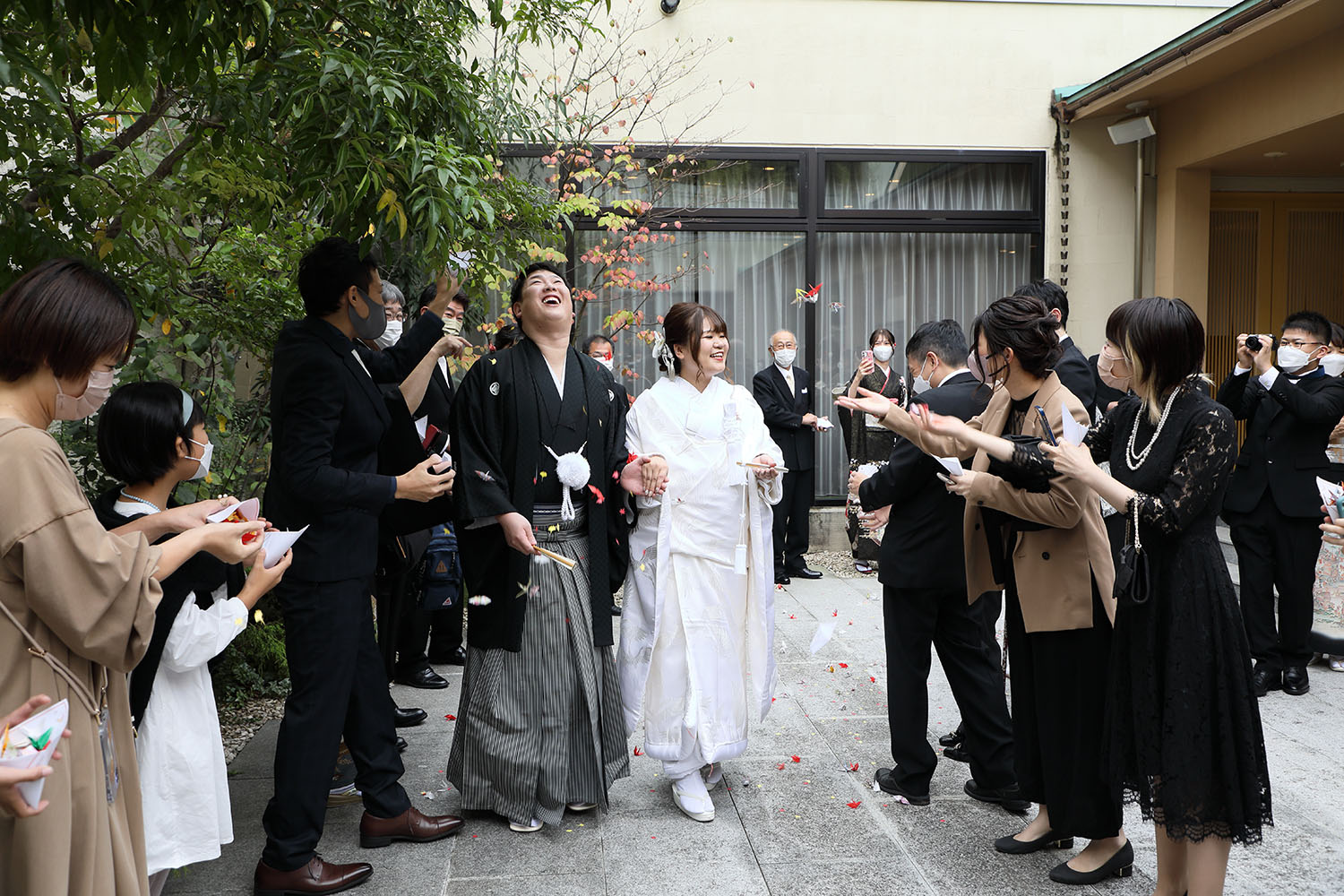 秋に式を挙げたので折鶴シャワーに紅葉とイチョウを織り交ぜたり