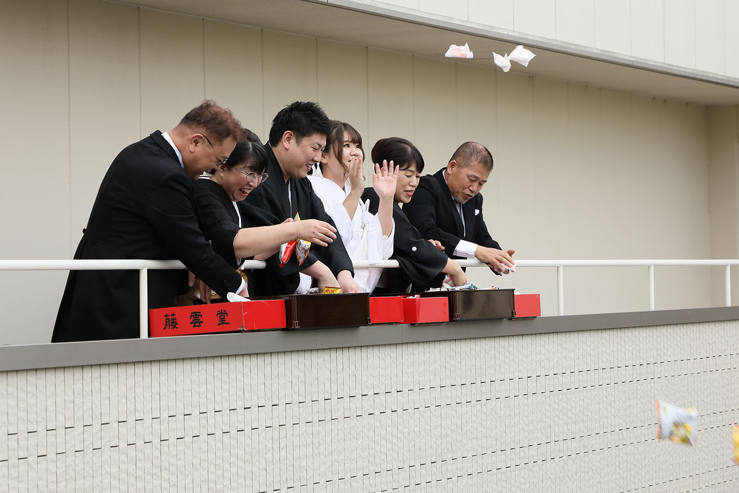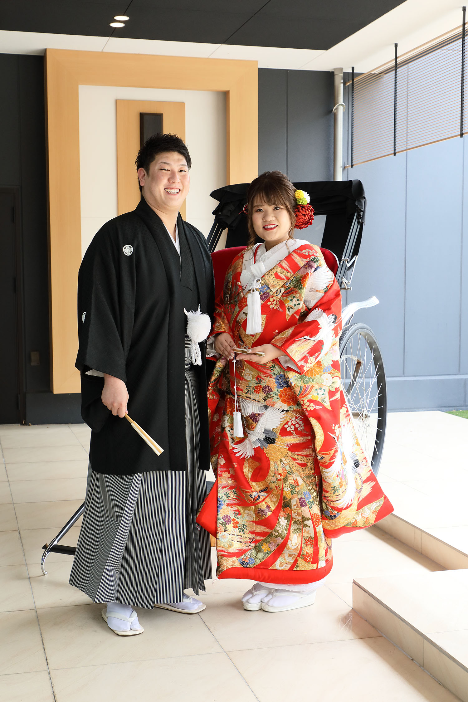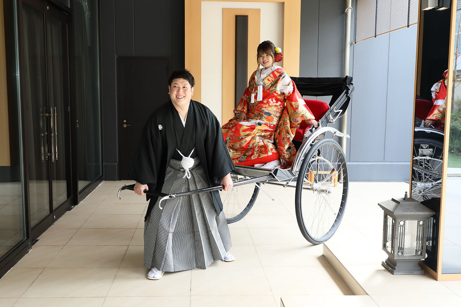 披露宴入場の際には人力車を新郎がひいて入場し番傘をさして会場を周りました