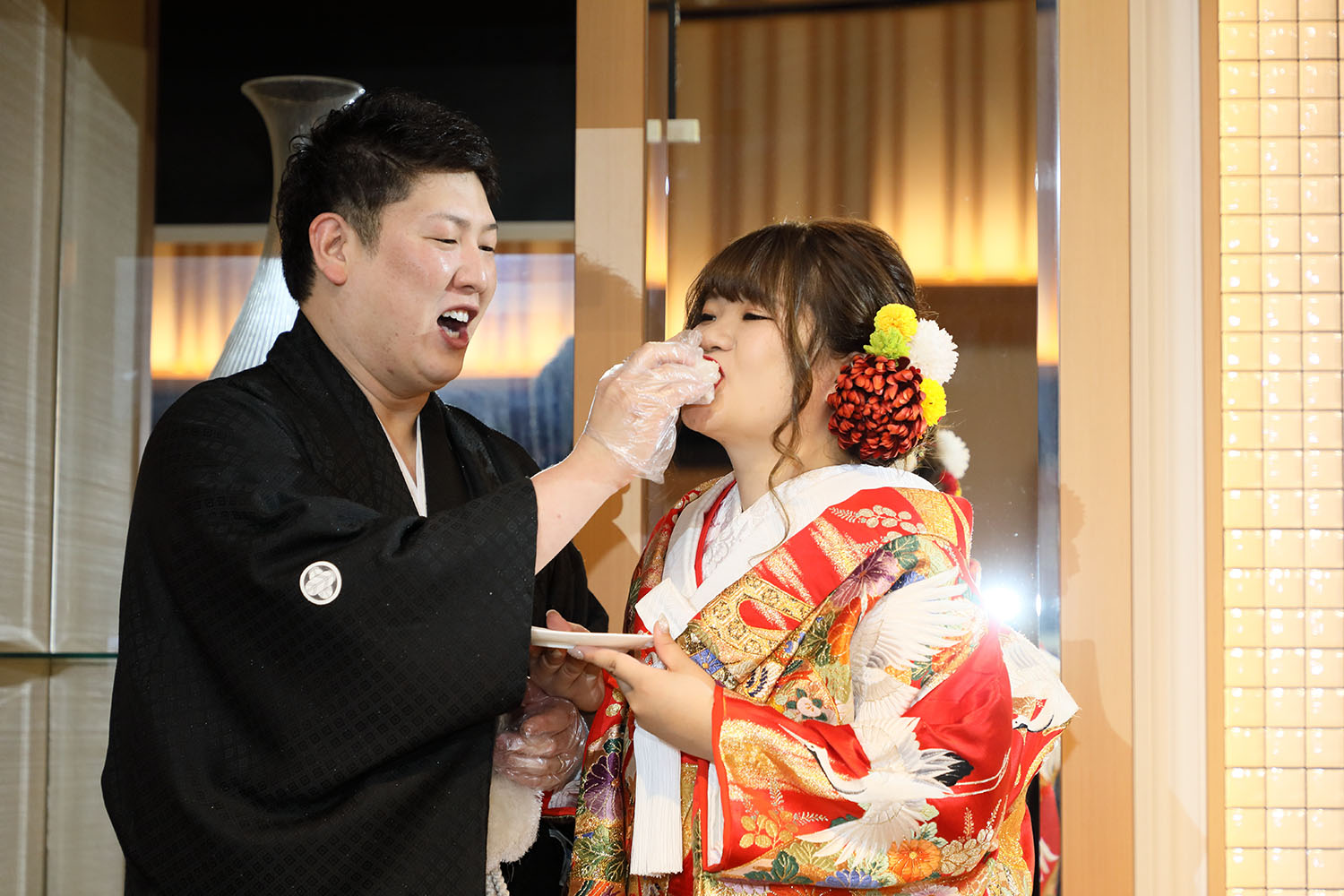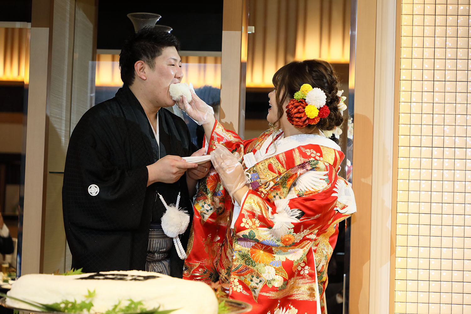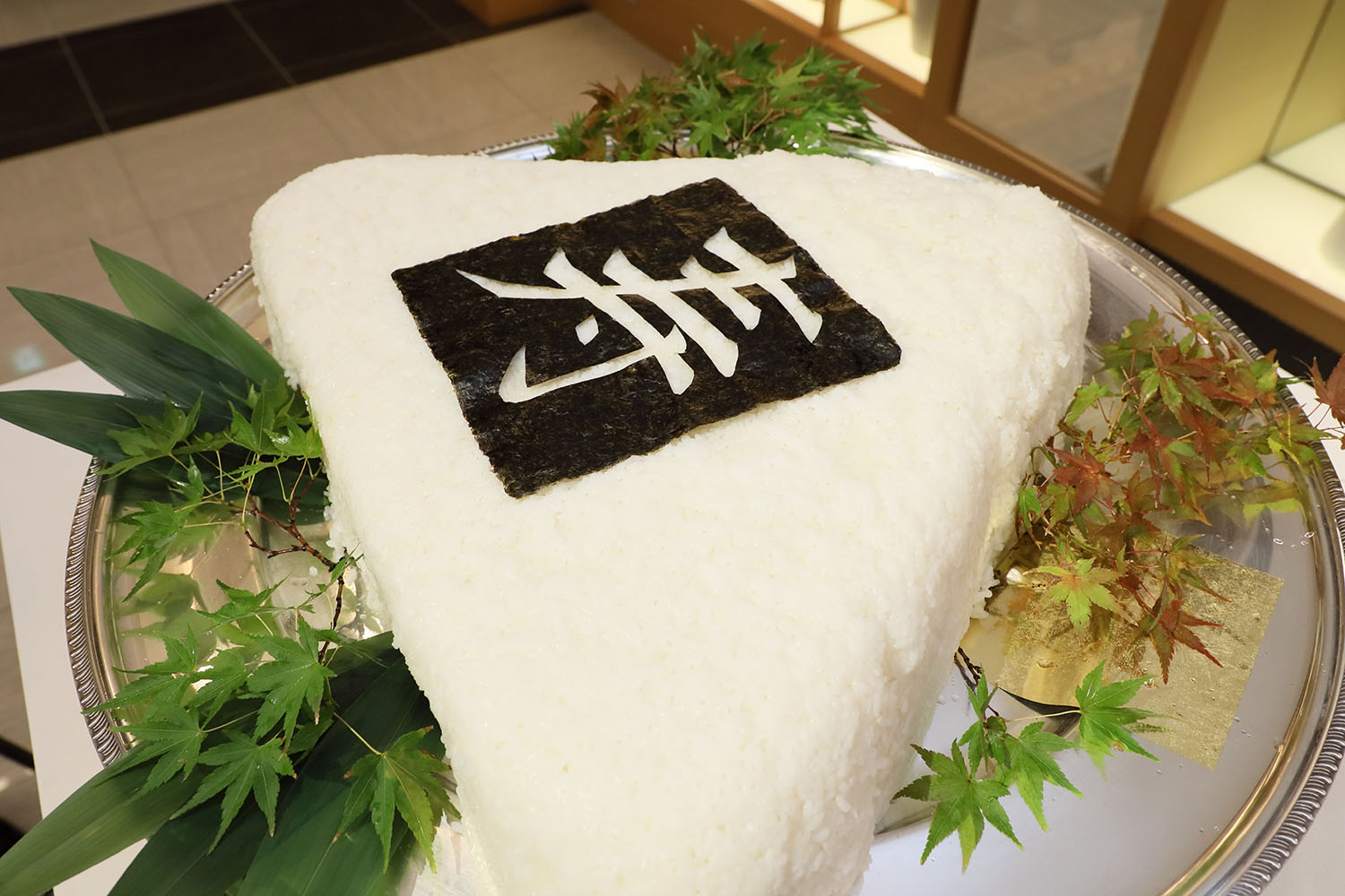 ウィディングケーキではなく大きなおにぎりを準備し ナイフではなく日本刀で入刀を行いました