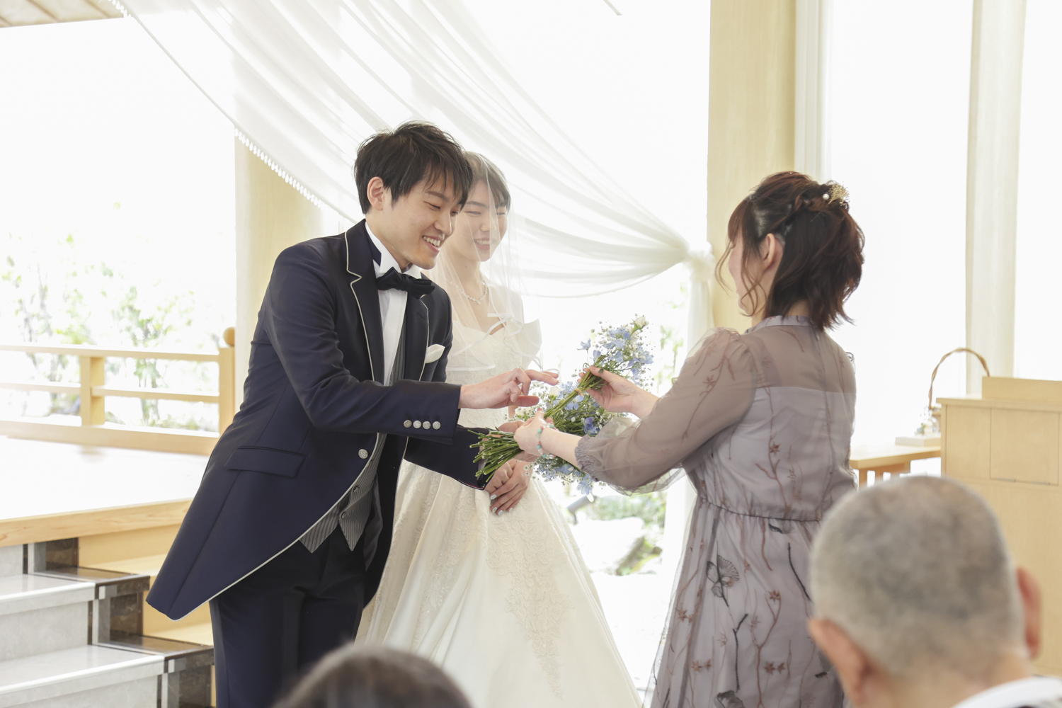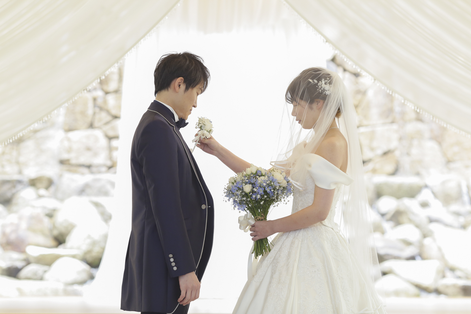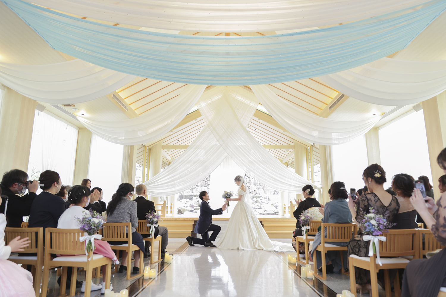 挙式会場には和のテイストに白と青のカーテンを足し柔らかな雰囲気にしました