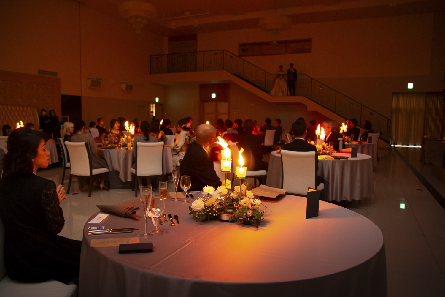 披露宴でも「私たちだけではなく全員が楽しめる式にしたい」と考えていたので 入場時にキャンドルを一斉に点火したり フランベショーやプロフィールの間違い探しを行ったりしました