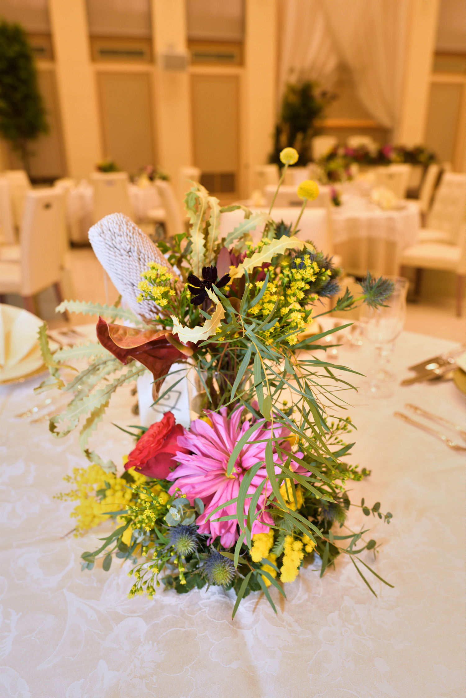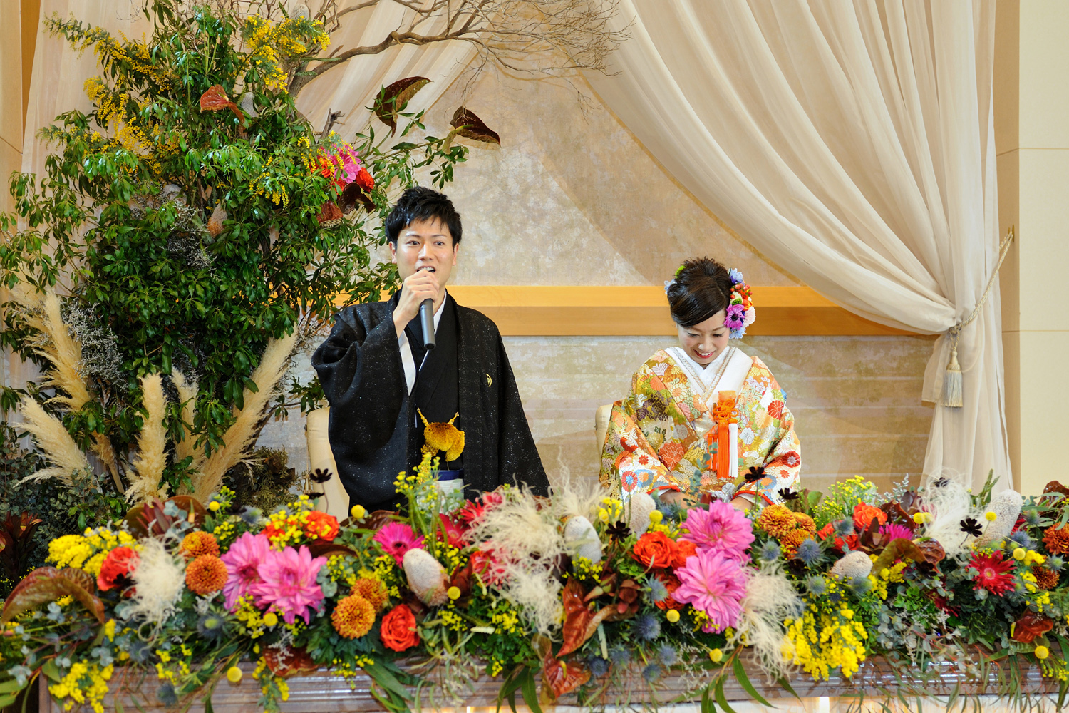 披露宴会場「陽だまり」は、新婦様こだわりのお花たちでより一層華やかに色づきました。