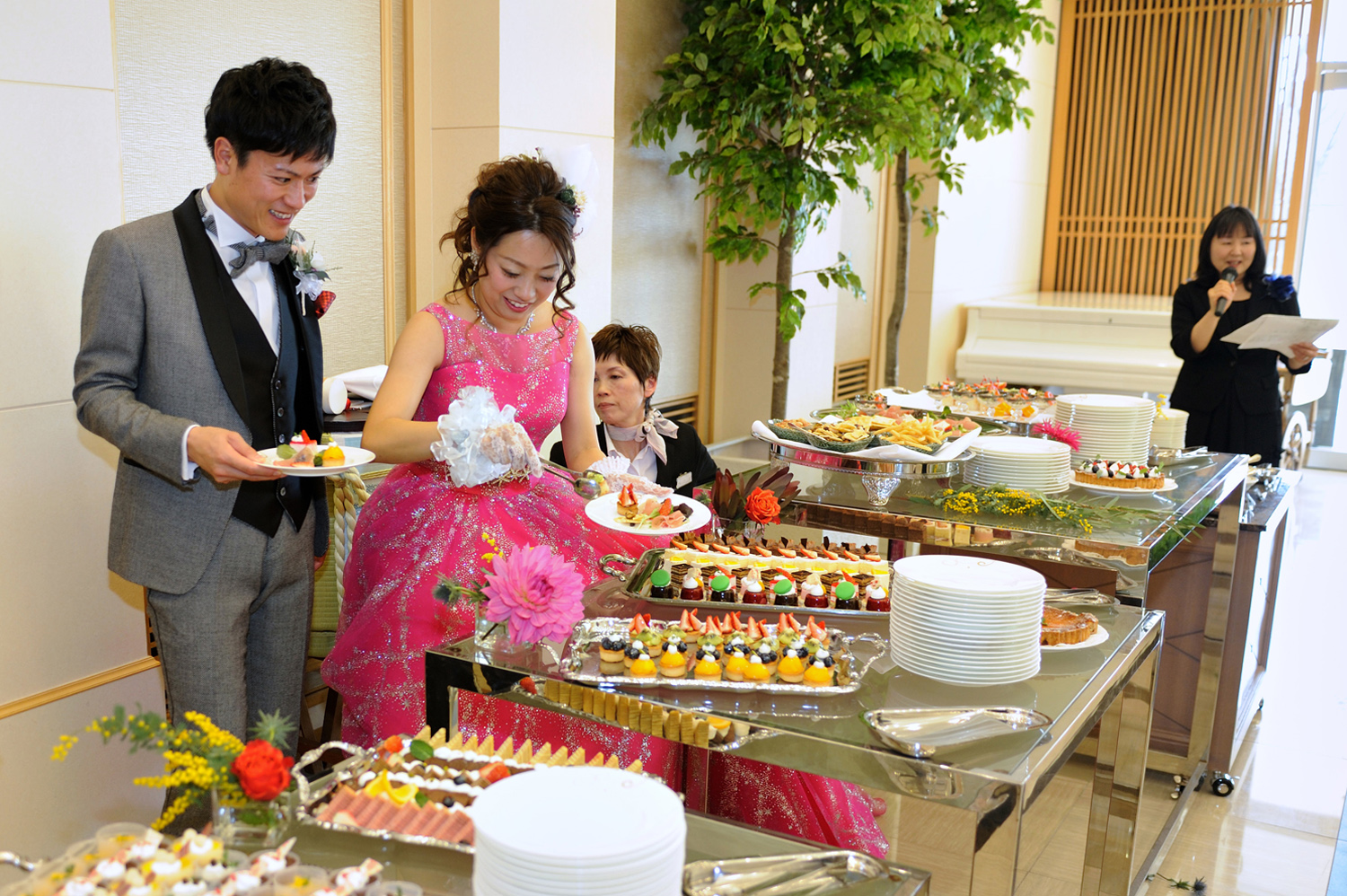 披露宴でこだわったのはお花が沢山あることと、デザートだけでなくパンやおつまみを取り入れたビュッフェで男性にも楽しんでもらえたらと用意した点です。