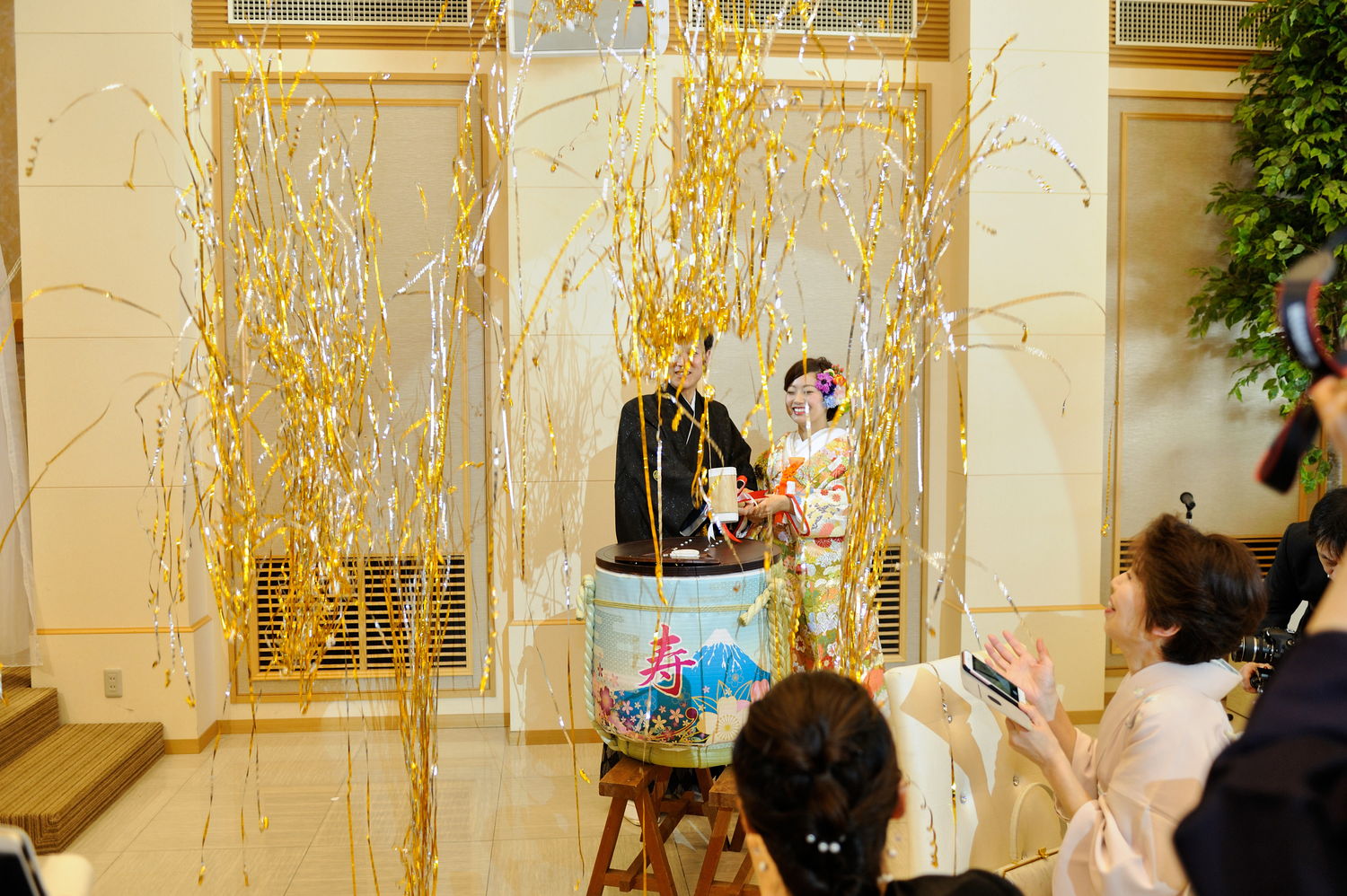 皆様が「鏡開き」の樽に注目する中、おふたりが木槌で開いて出てきたのは・・・