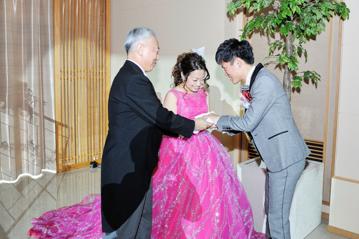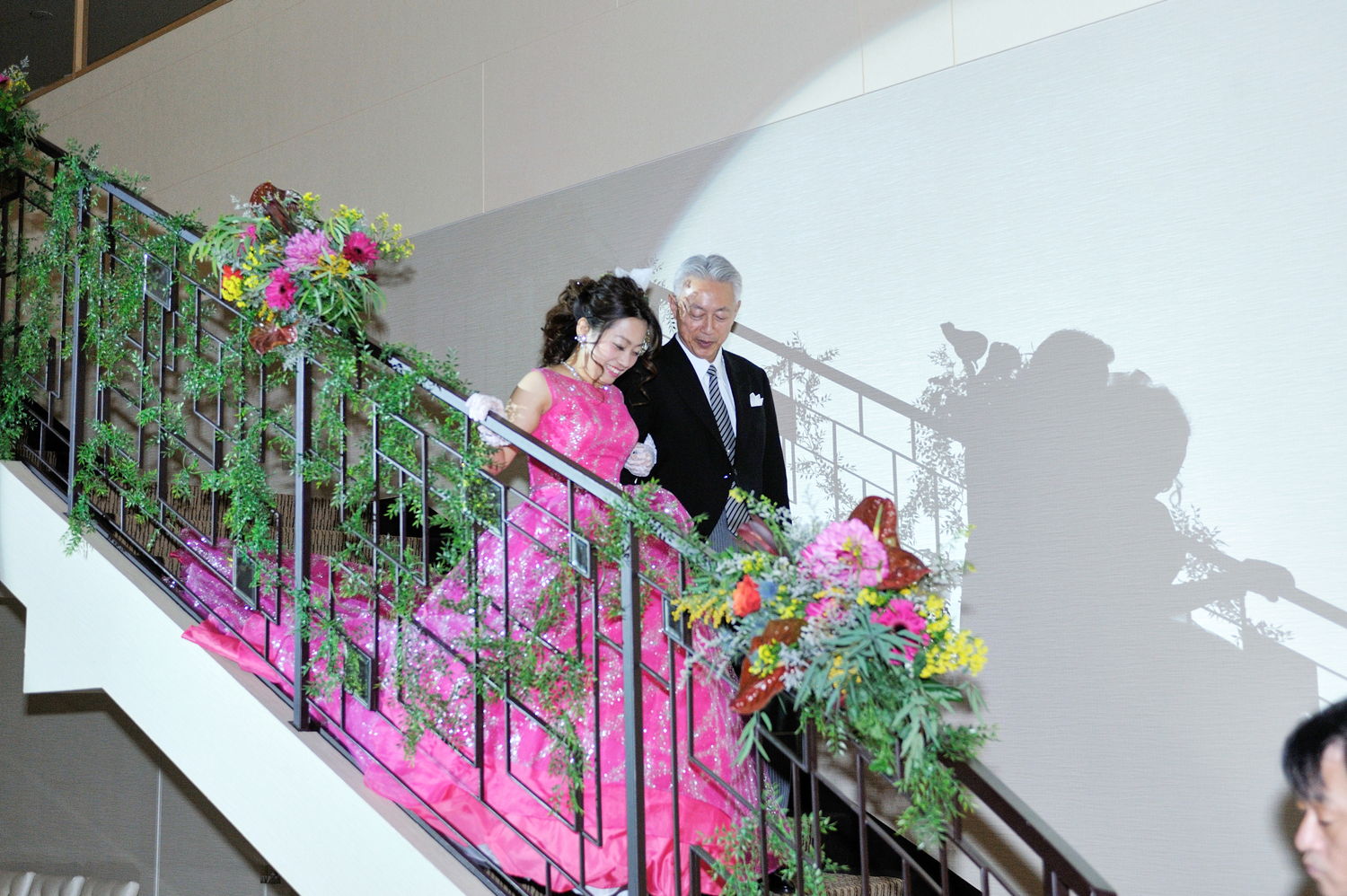 お父様に支えられながら笑顔でゆっくり降りた先で、新郎様にバトンタッチ。
