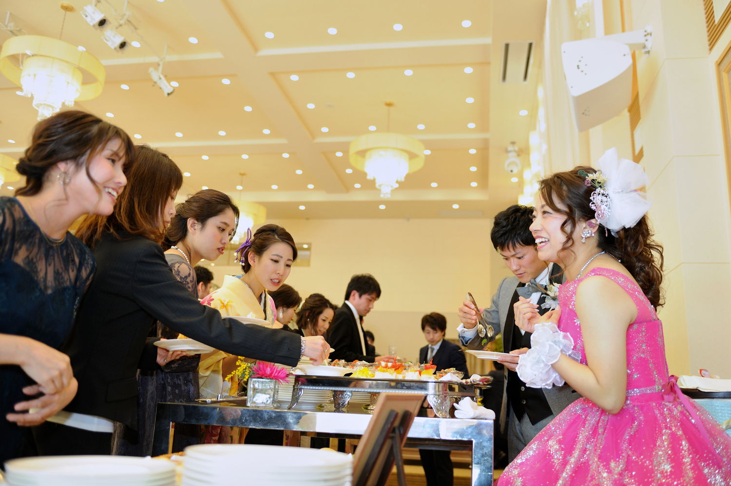 こだわりのお花に囲まれながら過ごした、サプライズ盛りだくさんの披露宴。デザートだけじゃないビュッフェは大好評♪