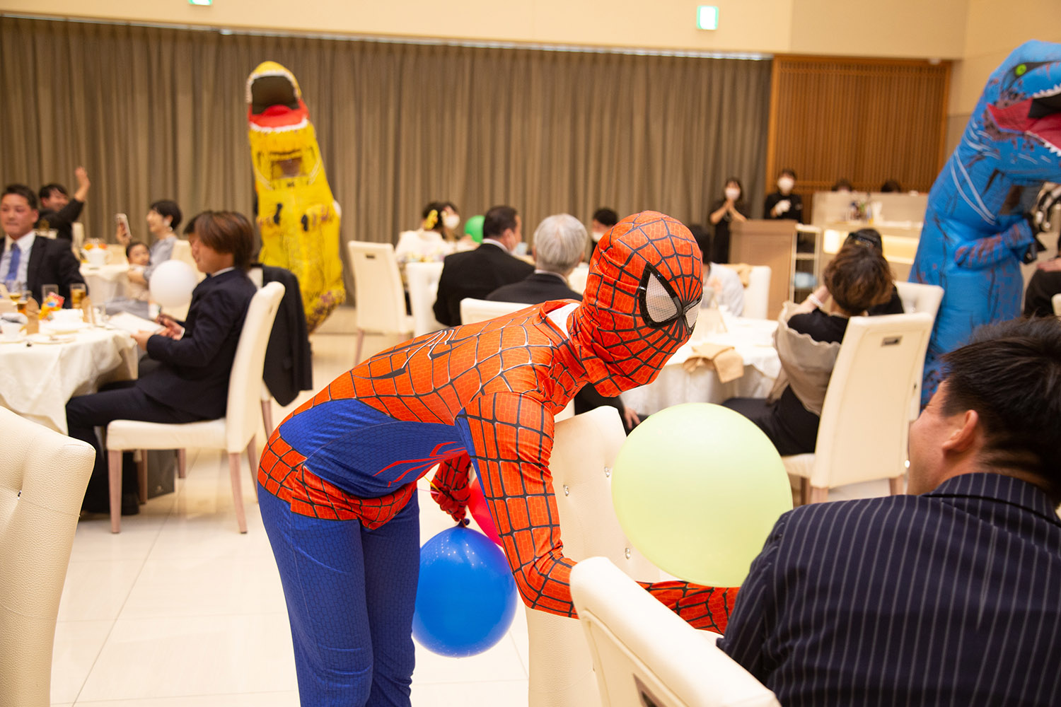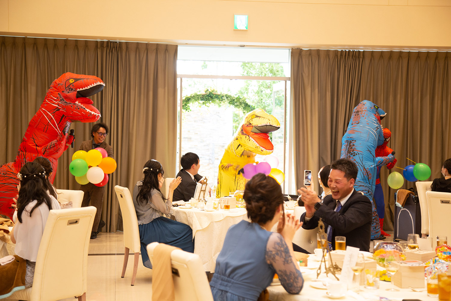 福井県名物の恐竜の着ぐるみを余興メンバーが着て会場を驚かせ
