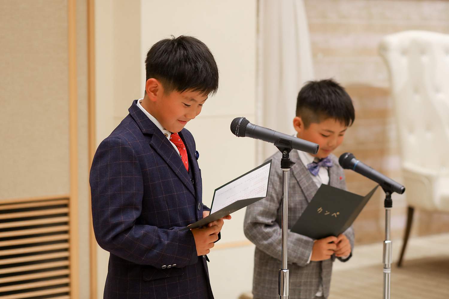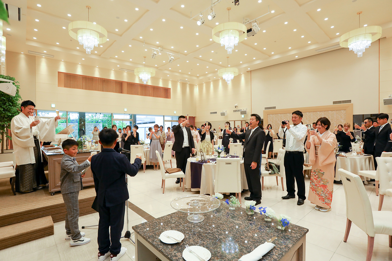 私たちの式は仲の良い友人や親族だけの式でしたので 堅苦しくせず大好きな甥っ子たちにリングボーイと乾杯の挨拶をお願いしました