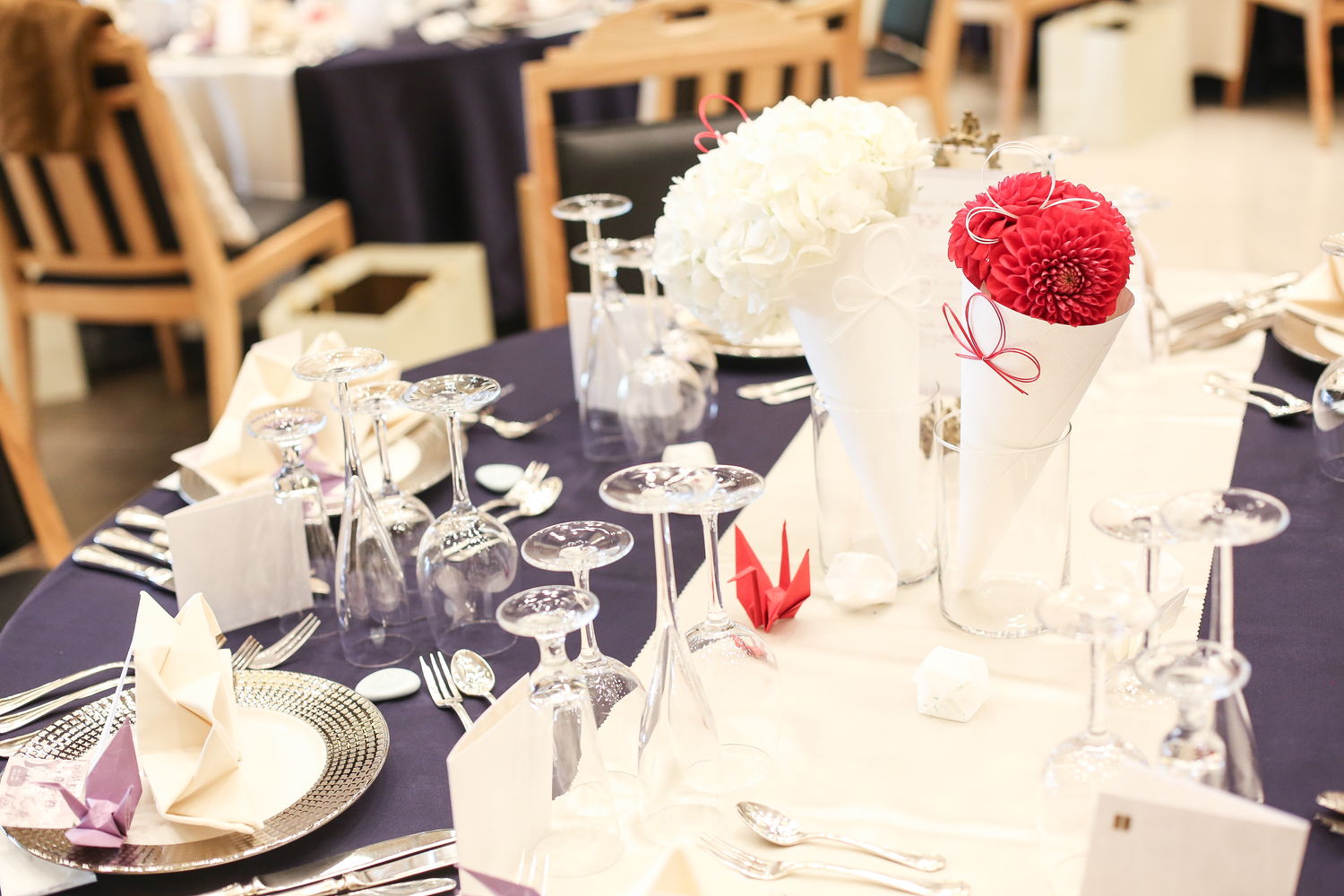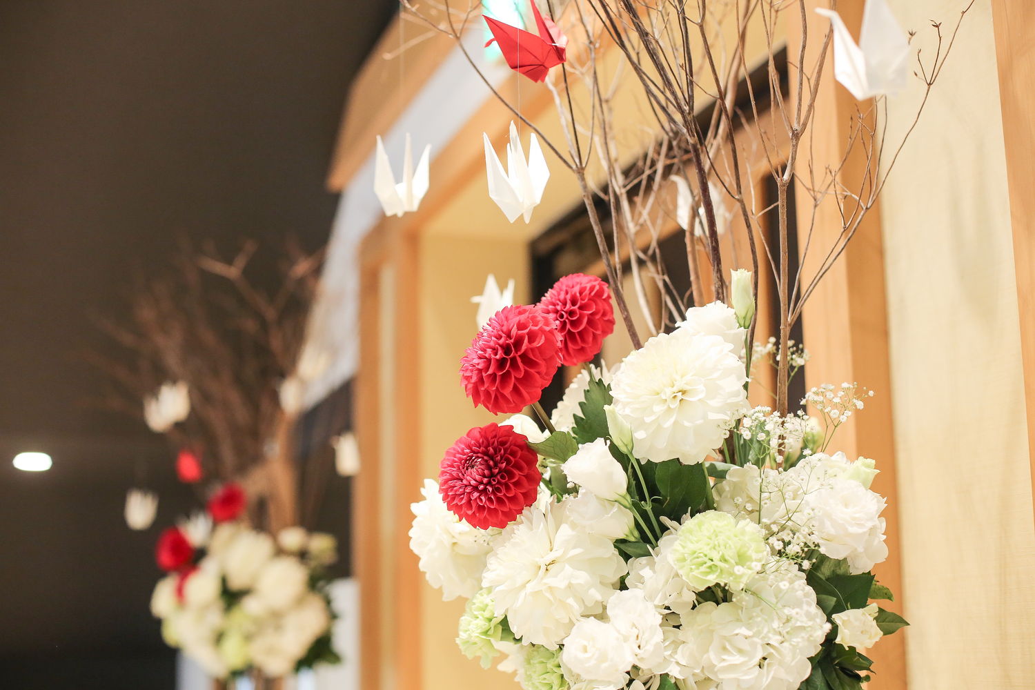 紅白の装花に折り鶴や水引をあしらい、上品な和のコーディネートに。