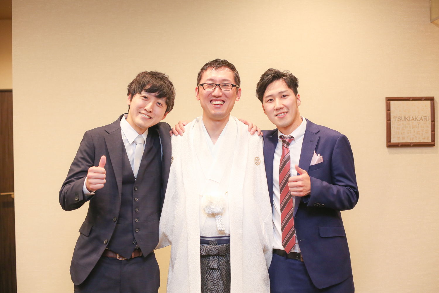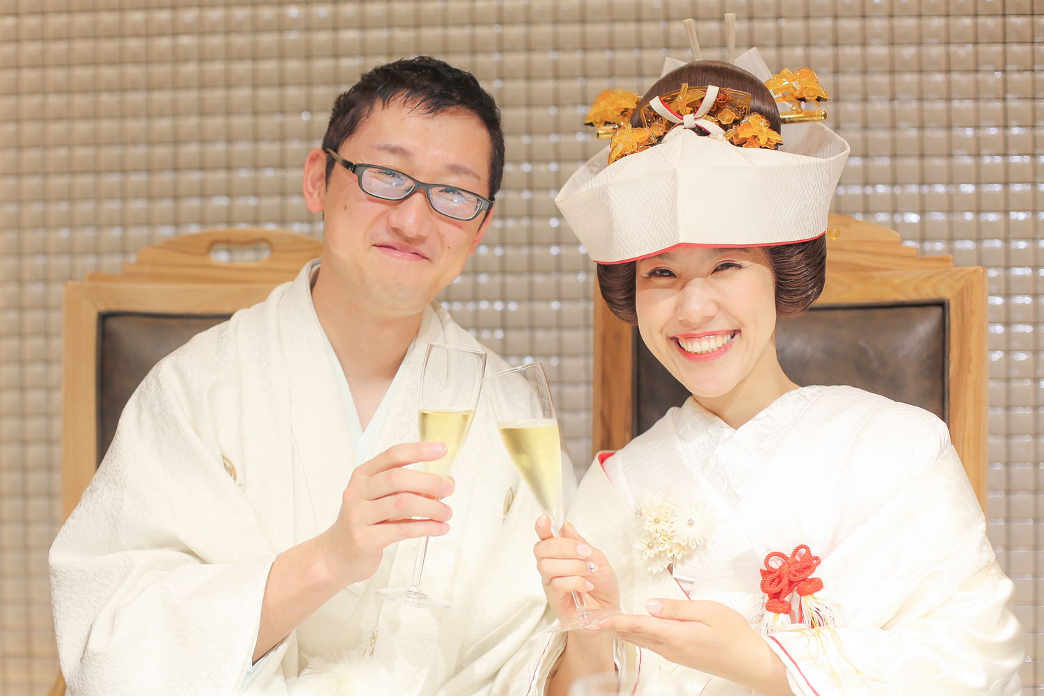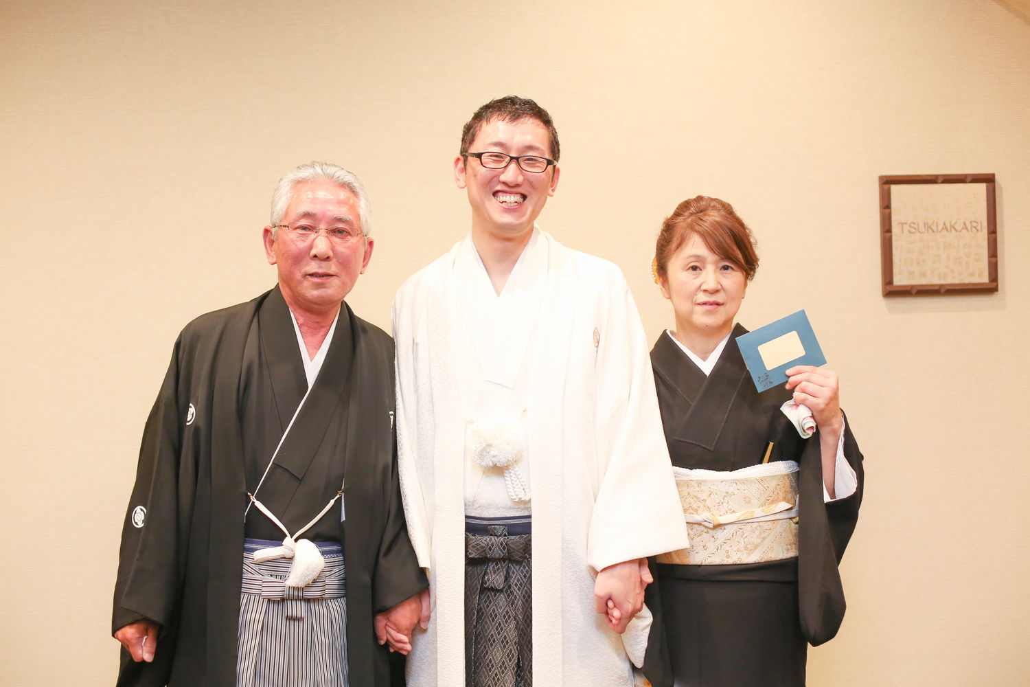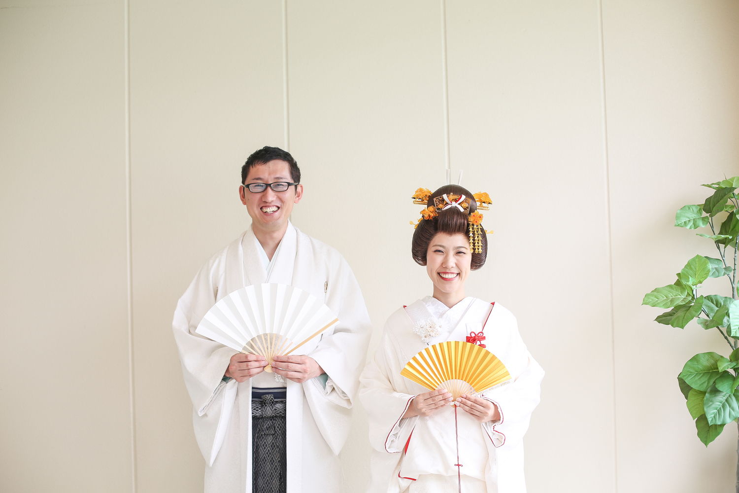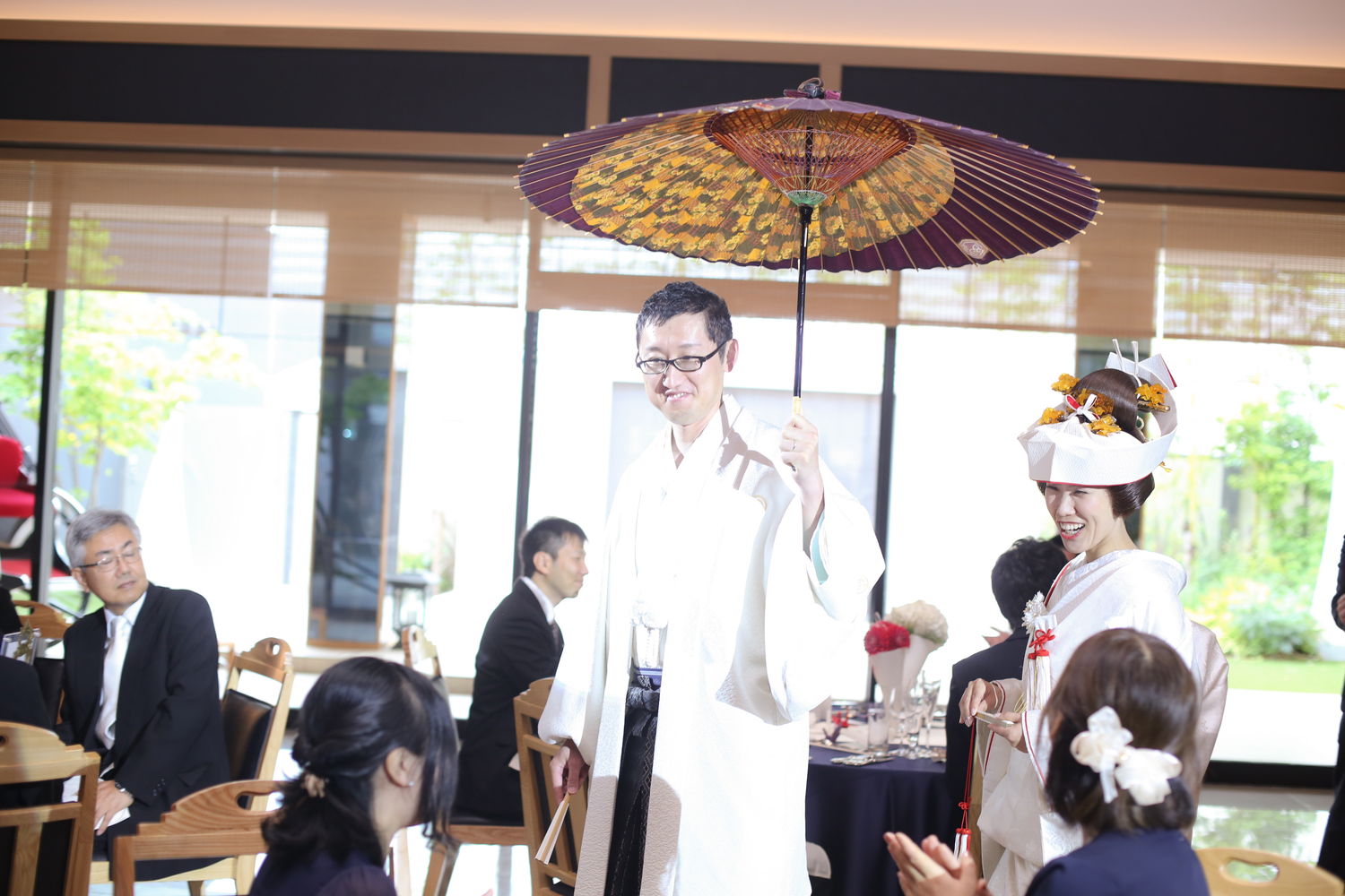 会場「月灯り」をイメージした和傘が、紋付袴と白無垢によく映えます。