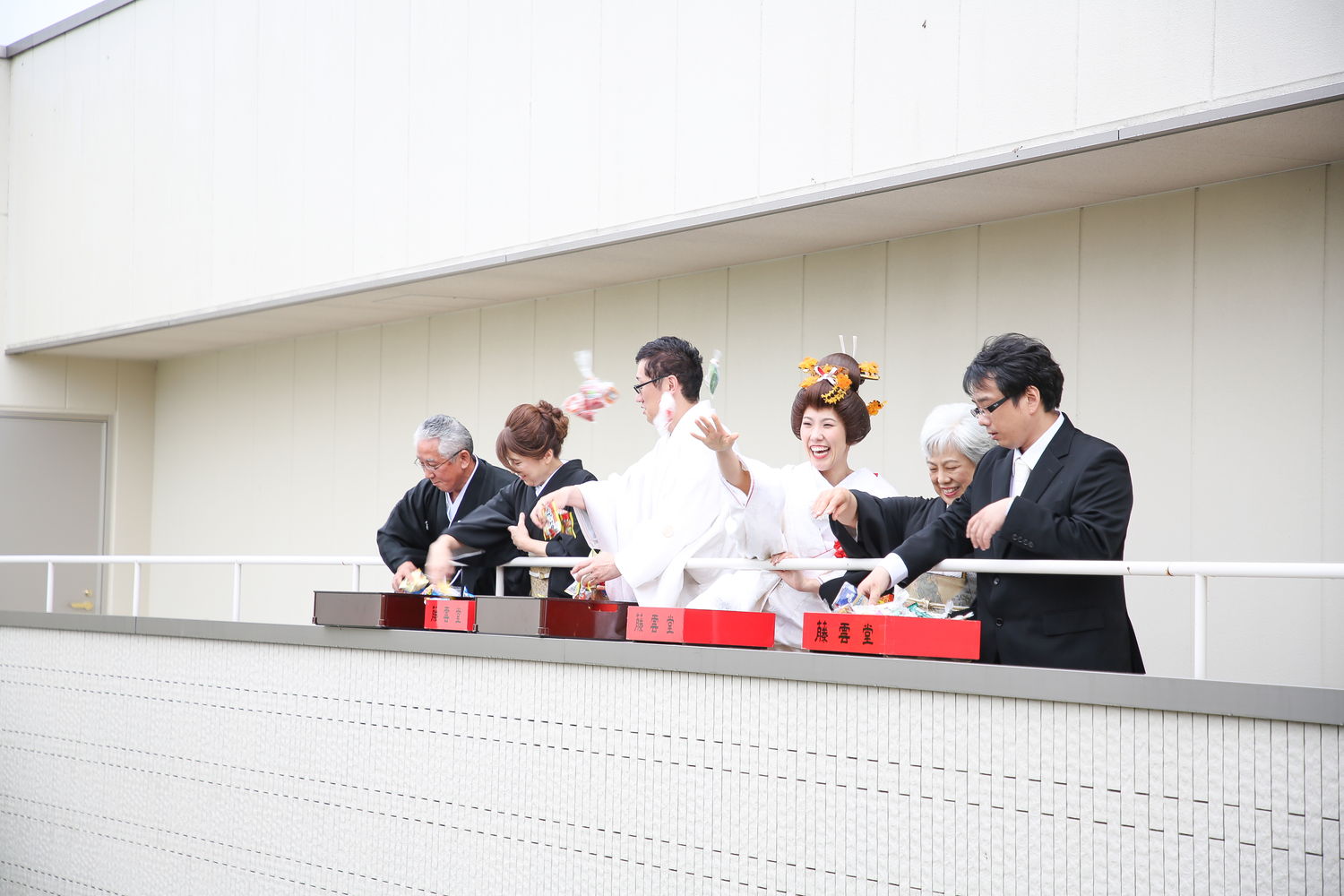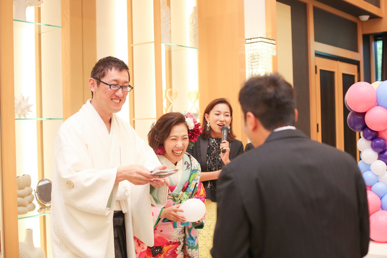 配ったおまんじゅうの裏にシールがはってあり、新郎様がキャッチしたバルーンと同じ色の方へプレゼントタイム♪