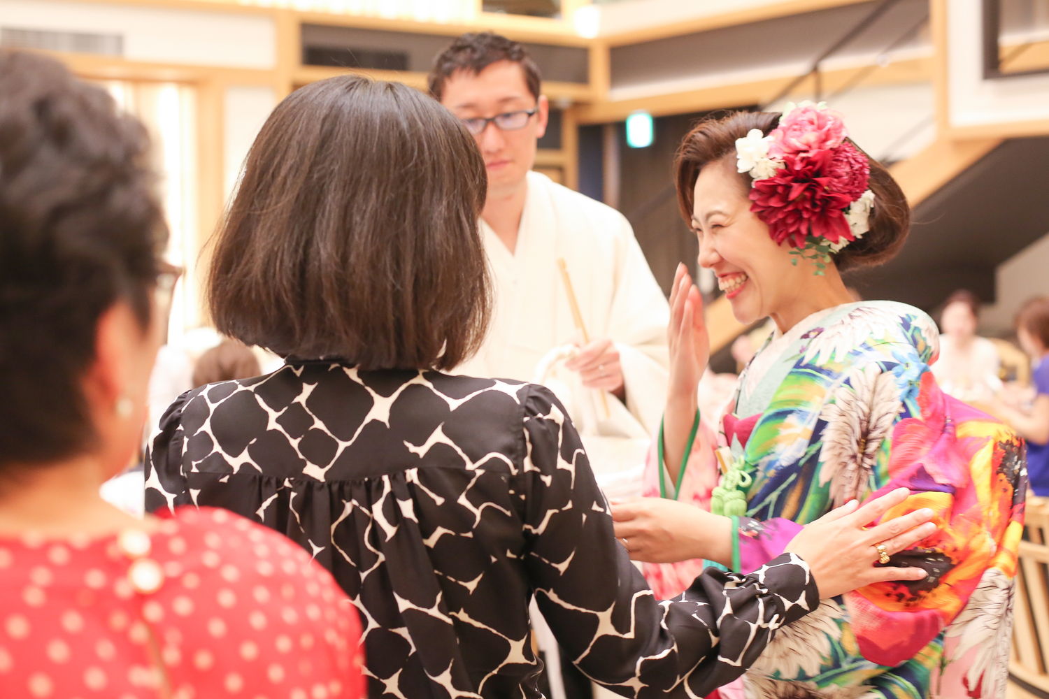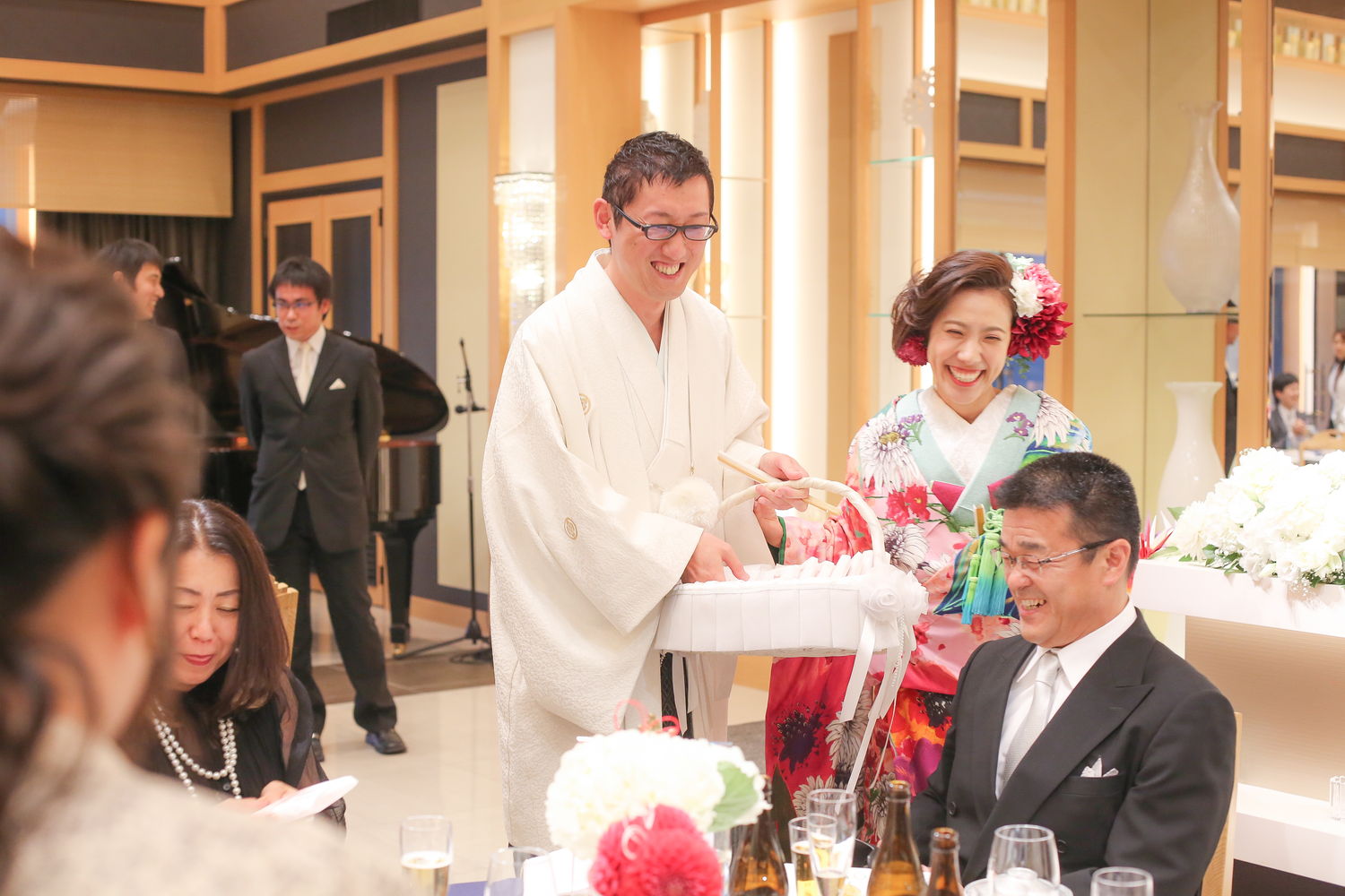 入場後のテーブルラウンドでは、お饅頭を配りながらゲストとの歓談のお時間に。